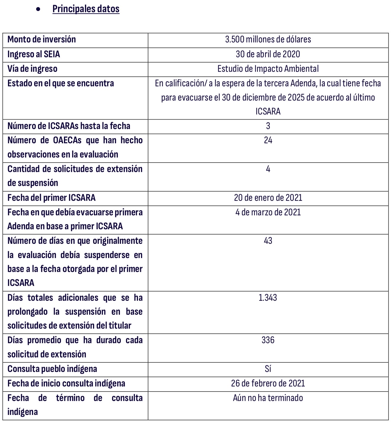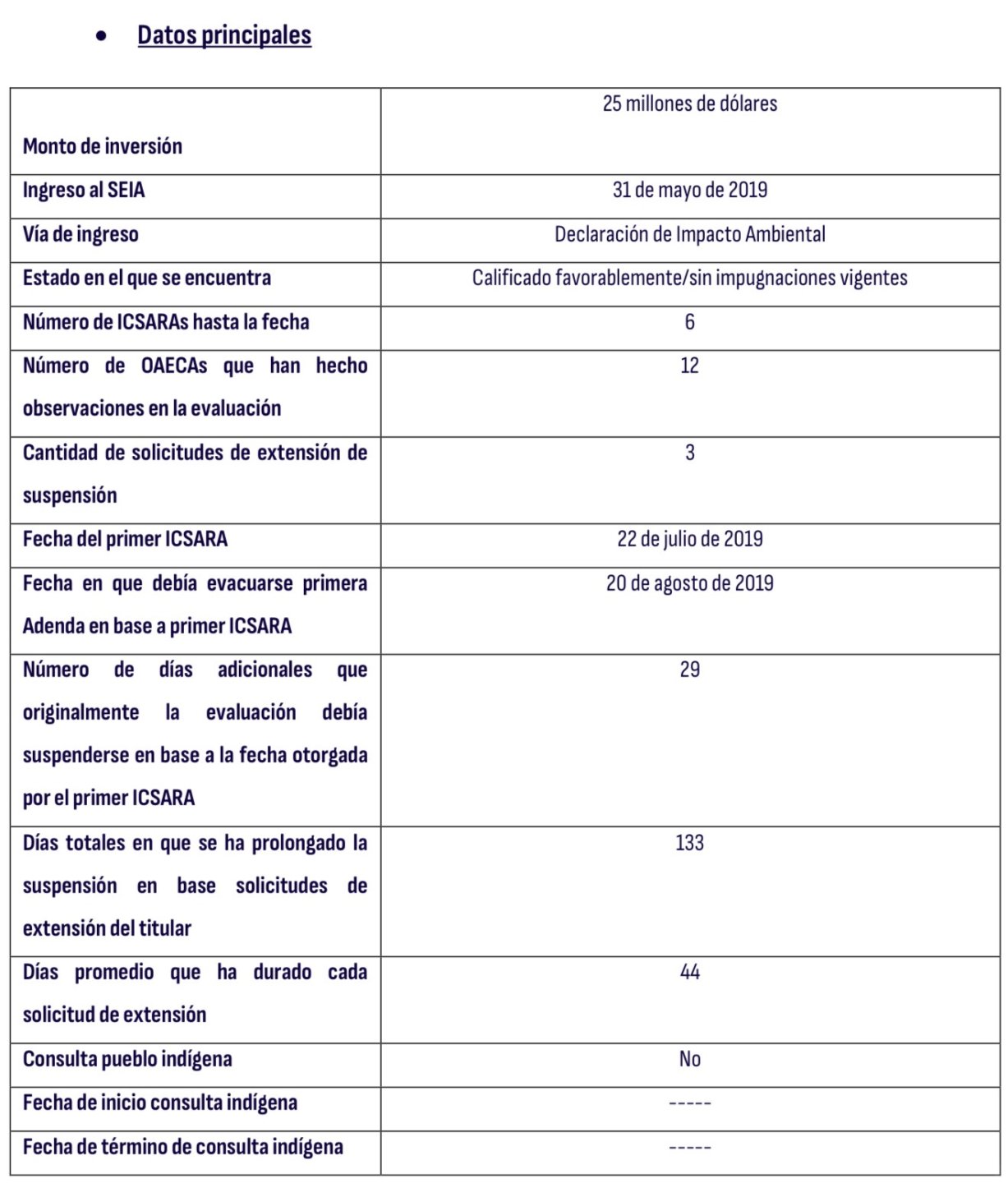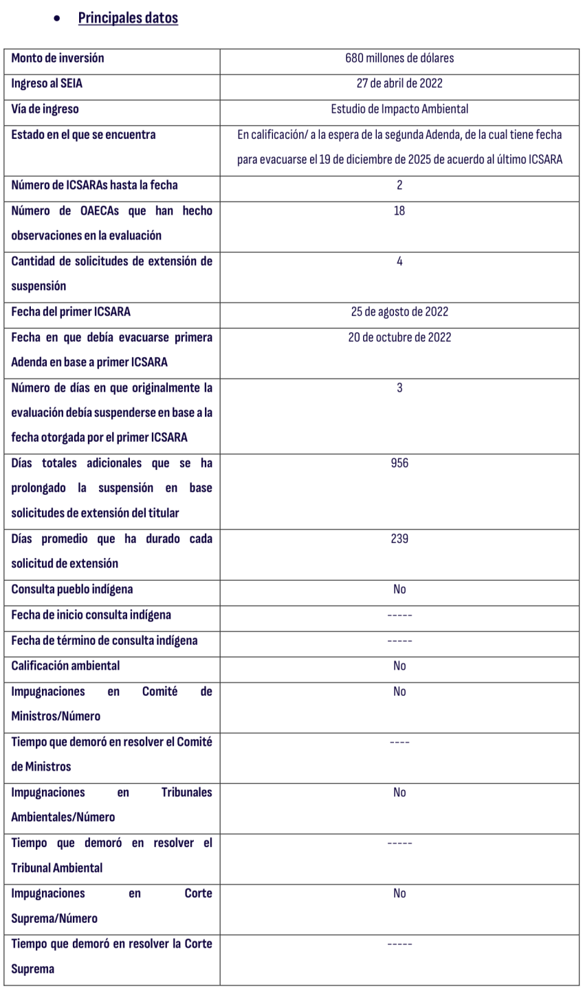 Este proyecto ingresó al SEIA en abril de 2020. Originalmente se dio fecha para evacuar la Adenda (respuesta del titular a las observaciones formuladas por servicios públicos) para marzo de 2021. Así, en un escenario favorable, era razonable que recibiera su calificación ambiental el primer semestre de ese año. Sin embargo, la cantidad y naturaleza de las observaciones han obligado al titular a solicitar extensiones para dar respuesta y mantener suspendida la evaluación en 3 años y 8 meses.