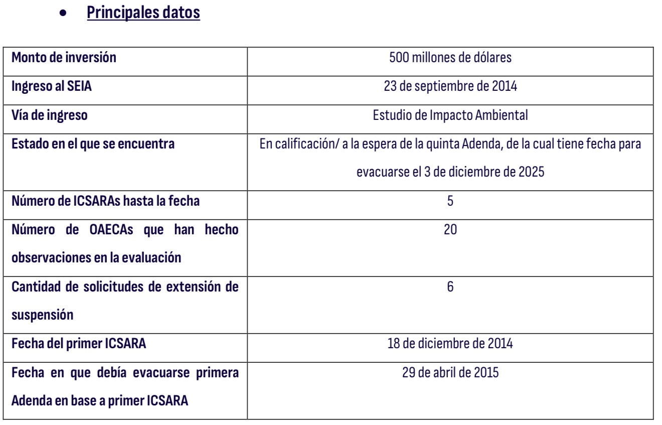 Cabe hacer presente que el proyecto continúa en evaluación, estando suspendido el plazo para recibir calificación mientras se elabora una Adenda complementaria para responder al segundo Icsara, con plazo hasta el 19 de diciembre de 2025.