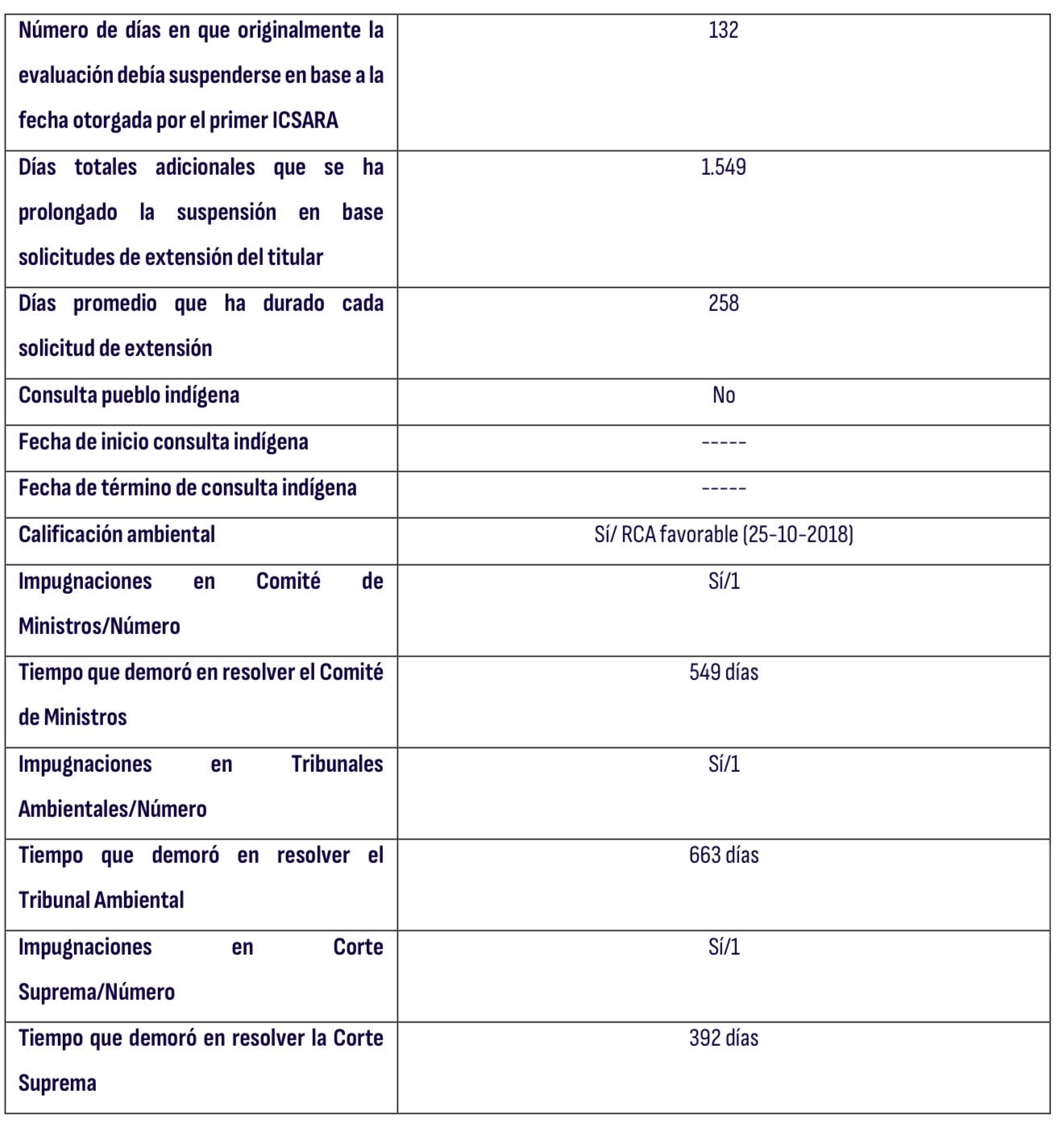 Este proyecto ingresó al SEIA en septiembre de 2017. En su primer Icsara se le dio plazo al titular para evacuar la Adenda en marzo de 2018, por lo que era razonable obtener su calificación ambiental el primer semestre de ese año. Sin embargo, y tal como ha ocurrido con todos los proyectos analizados, la cantidad y naturaleza de las observaciones de organismos públicos han obligado a solicitar extensiones para dar respuesta y mantener suspendida la evaluación en 1 año y 7 meses.
