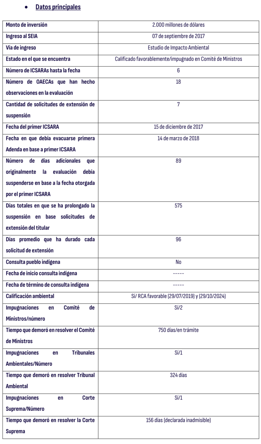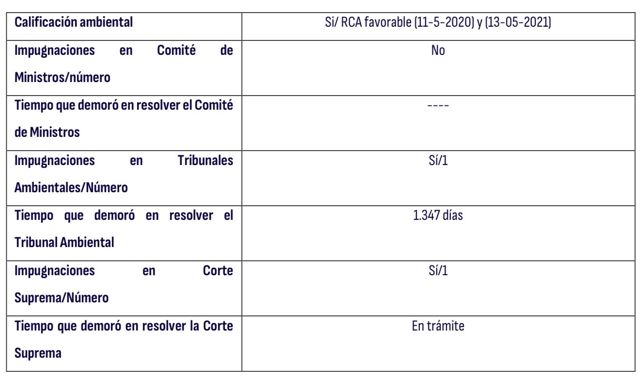 Este proyecto obtuvo RCA favorable el 29 de julio de 2019, pero fue objeto de reclamación administrativa ante el Comité de Ministros, que lo acogió, retrotrayendo el proceso a evaluación ambiental. Pese a ello, terceros al proyecto dedujeron un recurso de reclamación judicial ante el Segundo Tribunal Ambiental para que se rechazara el proyecto, lo cual fue rechazado en octubre de 2022, con lo que se reinició la evaluación ambiental hasta una segunda calificación favorable el 29 de octubre de 2024. Sin embargo, ésta fue nuevamente reclamada y hoy está pendiente de resolución.