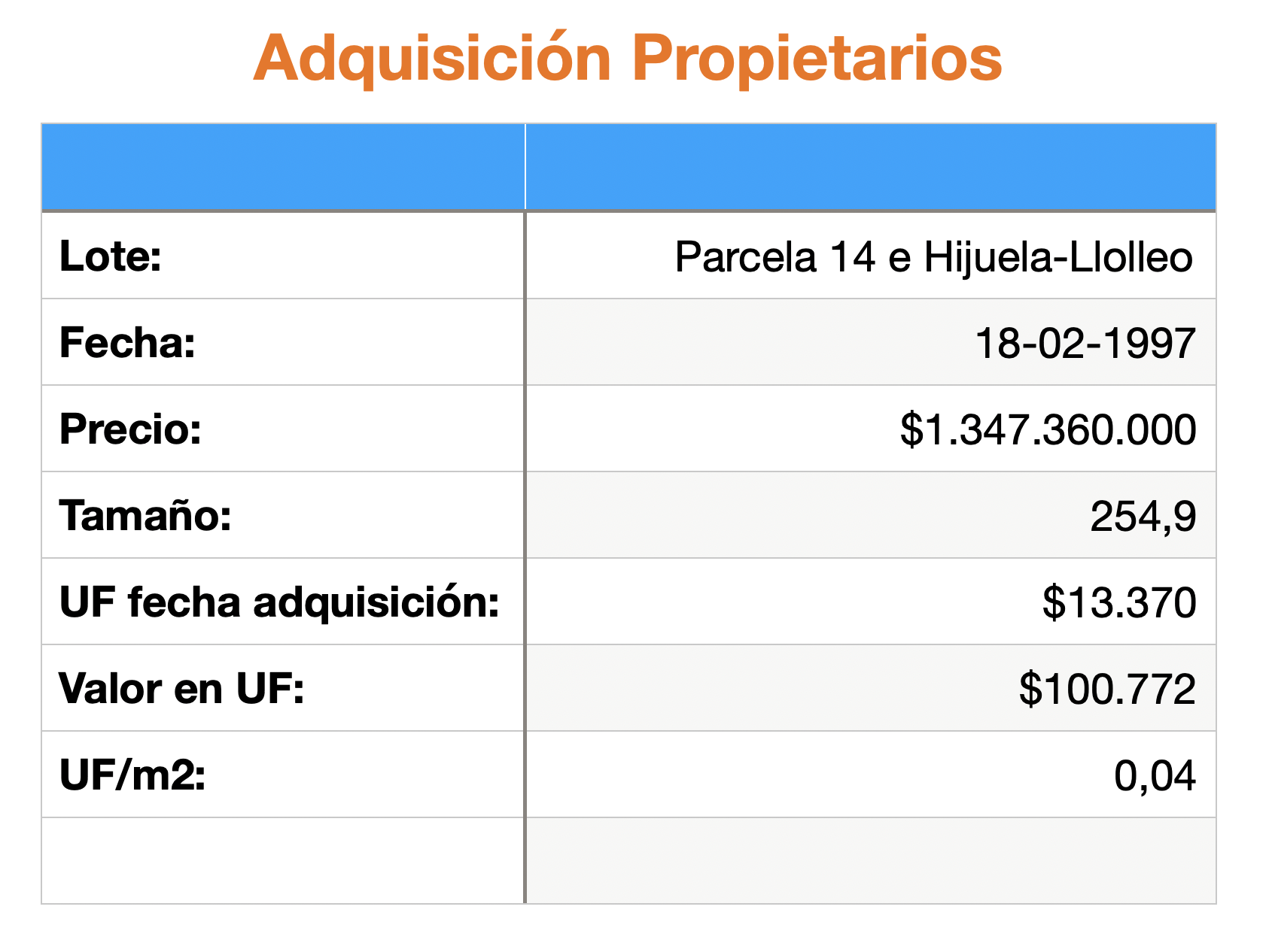 El siguiente cuadro muestra detalles de la adquisición de los propietarios el año 1997.