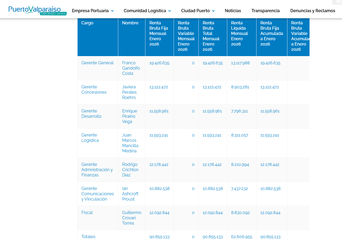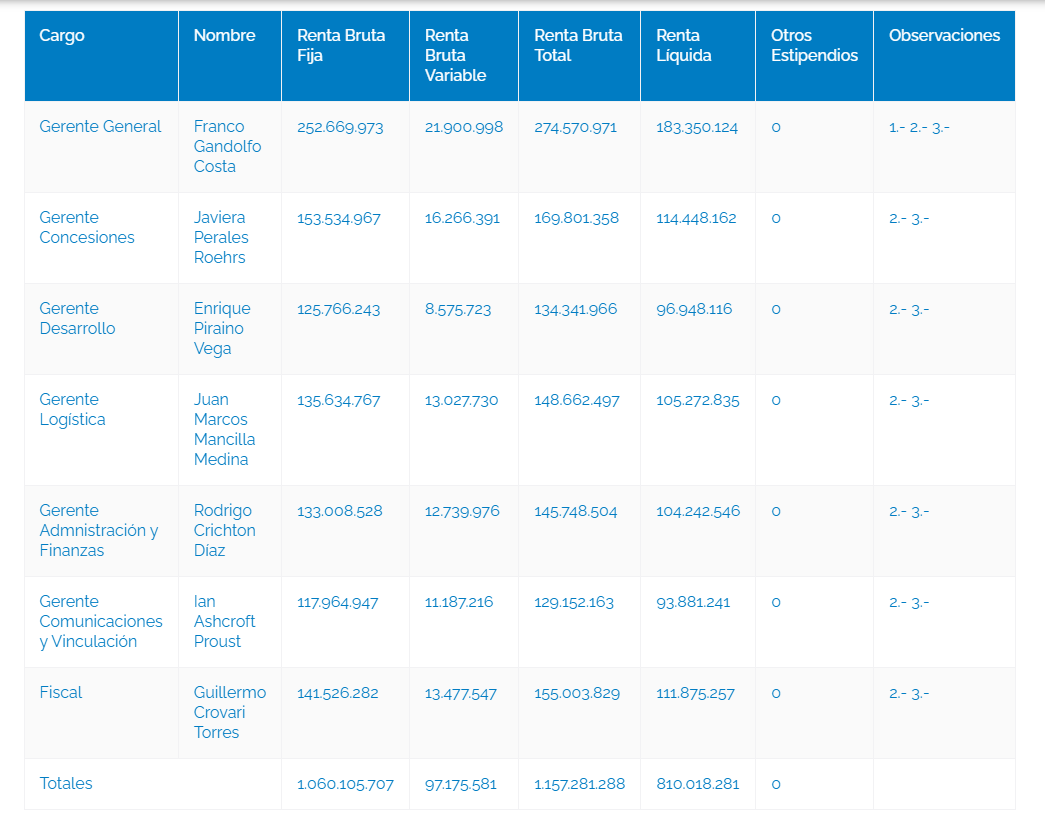 Los “Súper Sueldos” de la estatal EPV son exactamente repartidos en tan sólo siete personas. Estos trabajadores, que ya pudimos corroborar son los más altos del mercado de empresas estatales portuarias, están compuestos por Franco Gandolfo como gerente general, con una renta brutal variable de 21 millones 900 mil pesos por mes y 252 millones al año. Luego viene la gerente de concesiones, Javiera Perales, con una renta anual de 153 millones de pesos. El gerente de desarrollo, Enrique Piraino, con $125 millones al año y cerca de 8,5 millones por mes. El gerente de logística, Juan Marcos Mancilla, con 135 millones anuales. El gerente de administración y finanzas, Rodrigo Crichton, con una renta de $177 millones anuales. El gerente de comunicaciones, Ian Ashcroft, con $117 millones por año; y cierra el cuadro el fiscal Guillermo Crovari, con una renta de 141 millones de pesos por año.