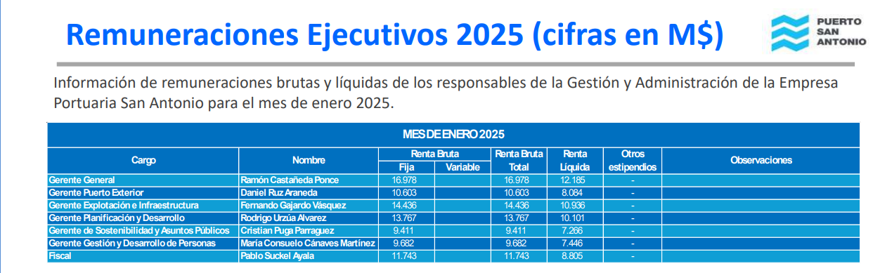 Para entender cómo se llegan a esos millonarios montos, debemos contextualizar que los sueldos de la línea ejecutiva de una empresa portuaria se define por el directorio de la compañía, basándose en la complejidad de la gestión, resultados obtenidos y siguiendo estructuras salariales de mercado.
