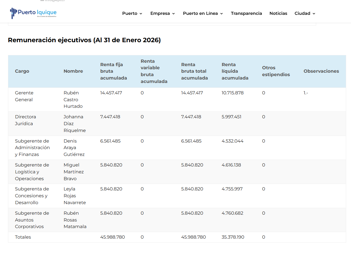 Ahora, si nos vamos a la Empresa Portuaria de Iquique (EPI), ahí el sueldo bruto mensual del gerente general de la estatal llega a los 14 millones de pesos mensuales, es decir, $7 millones menos que su par de Valparaíso.