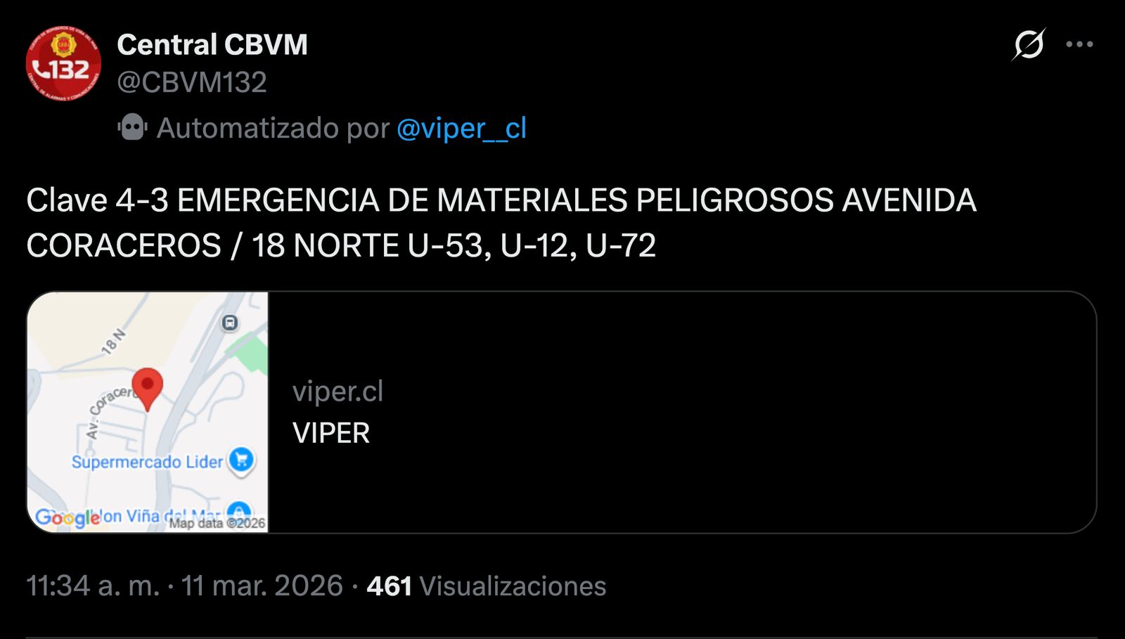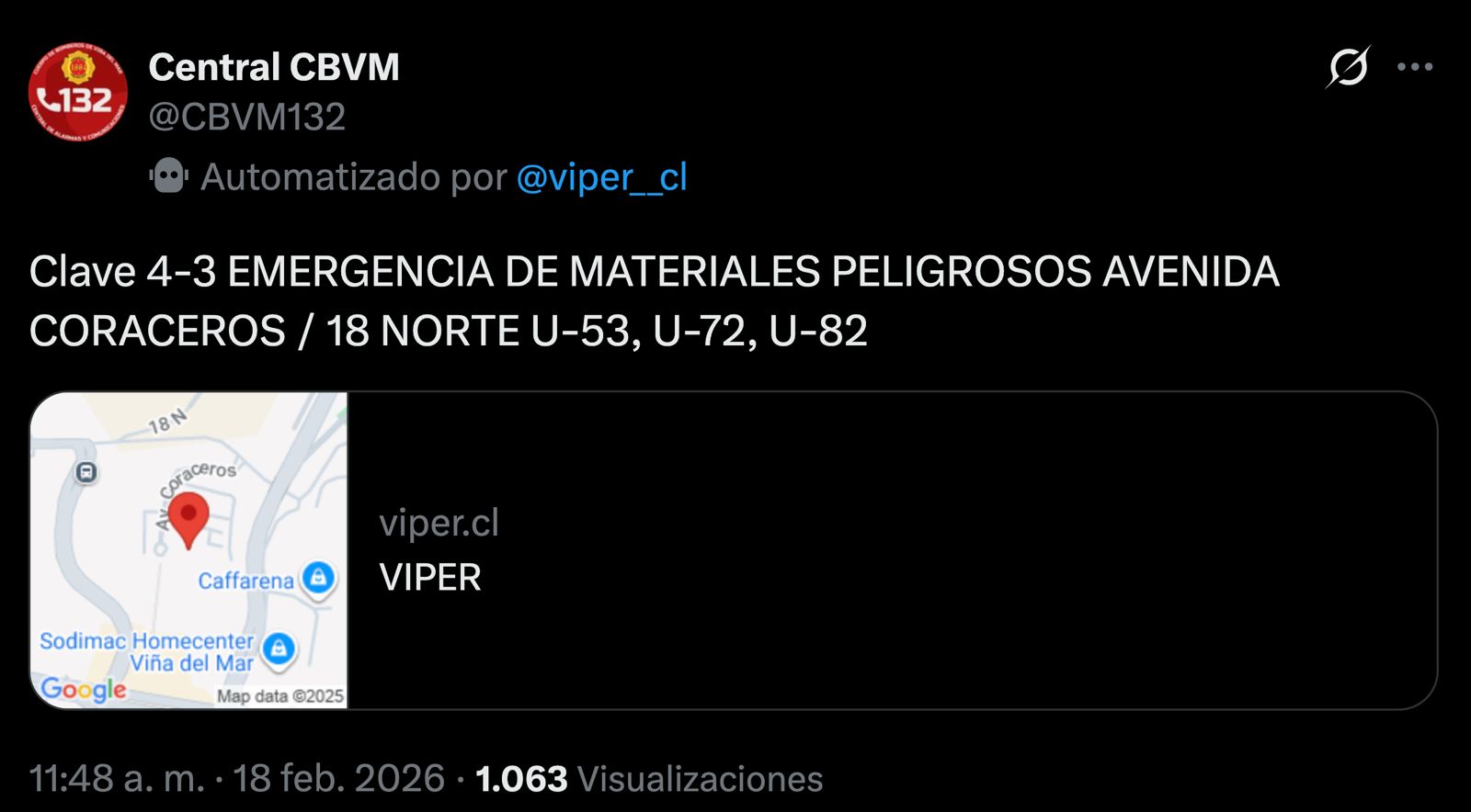 Debido a estas denuncias, hasta la intersección de avenida Coraceros con calle 18 Norte concurrieron diversas unidades del Cuerpo de Bomberos de Viña del Mar, además de funcionarios de Carabineros, equipos de Seguridad Ciudadana con móviles TENS de la Municipalidad de la Ciudad Jardín, personal del SAMU y trabajadores del Departamento de Gestión de Riesgo de Desastres de la casa edilicia.
