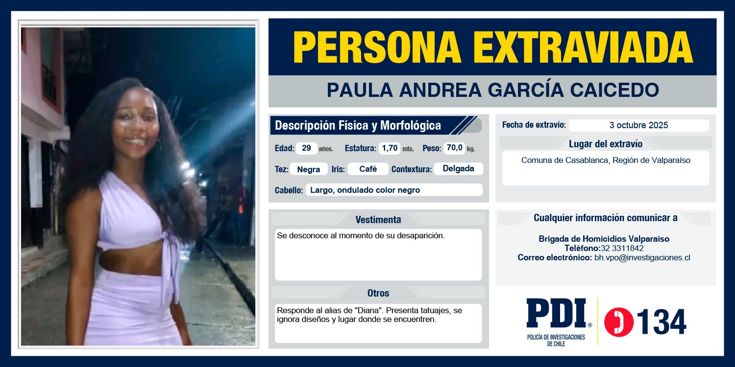 A ellos se suman José Duván Sinisterra Castillo, un adolescente de 15 años y 1,70 metros de estatura, y Paula Andrea García Caicedo, de 29 años y 1,70 metros, cuyos rastros se perdieron completo el pasado 3 de octubre. De los cuatro no se ha tenido noticia desde esas fechas, y no existe claridad respecto a las circunstancias en que se produjo su desaparición en esta comuna de la Quinta Región.