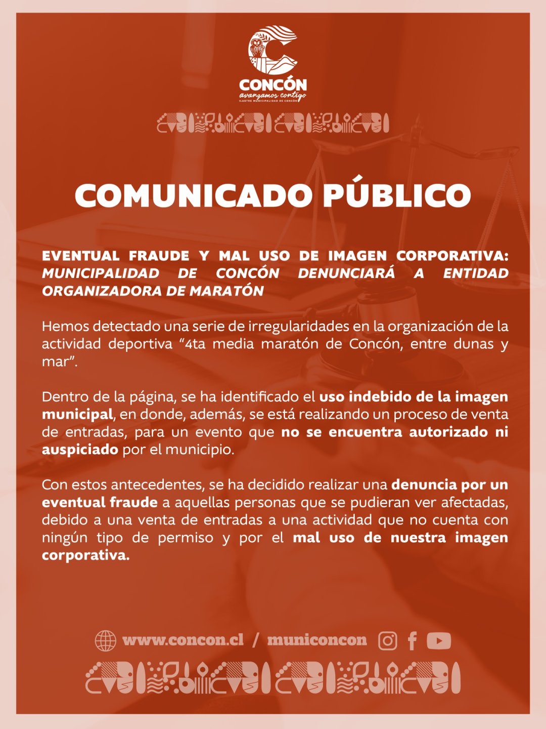 A través de un comunicado, indicaron que "hemos detectado una serie de irregularidades en la organización de la actividad deportiva “4ta media maratón de Concón, entre dunas y mar”.