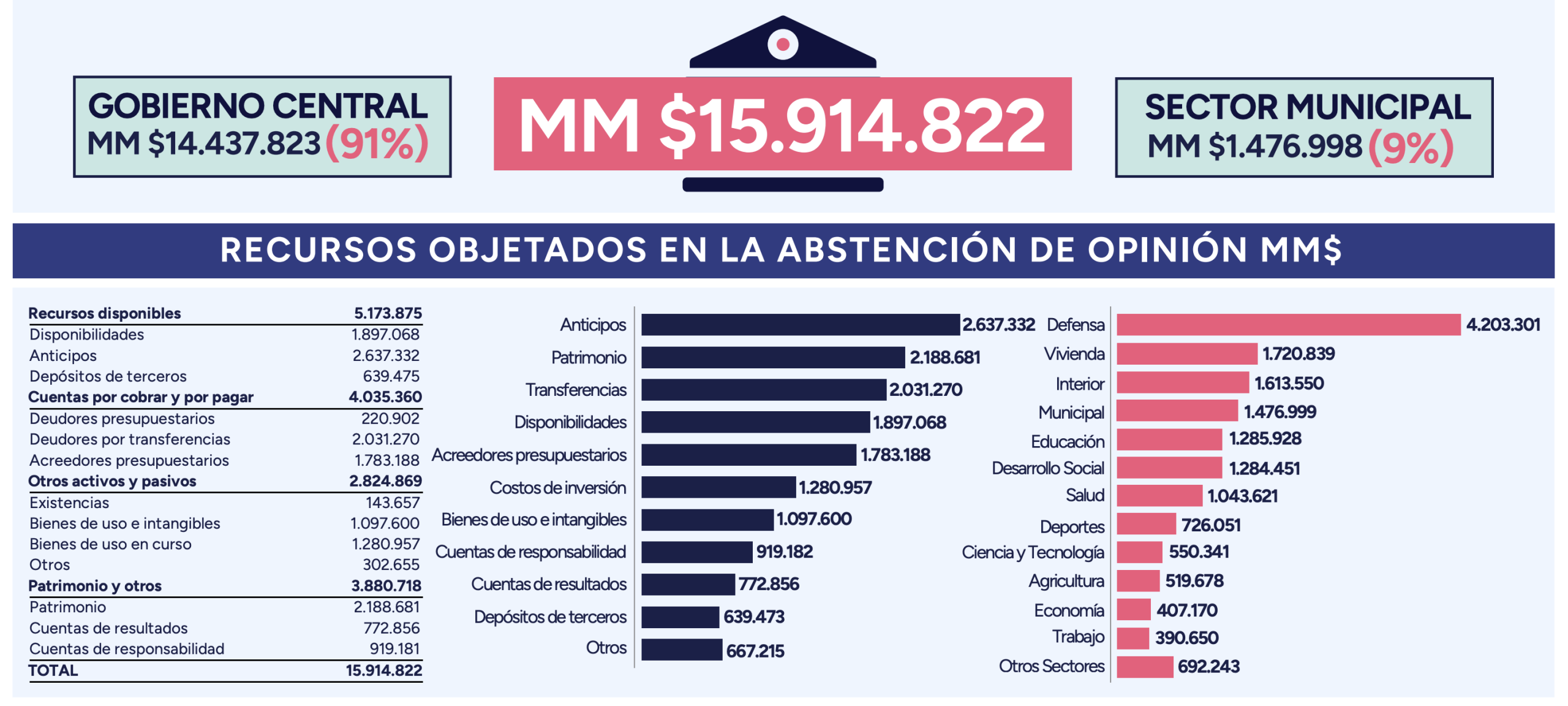 Entre los recursos objetados en la abstención de opinión, lideran anticipos ($2.637 millones), patrimonio ($2.188 millones) y transferencias ($2.031 millones).