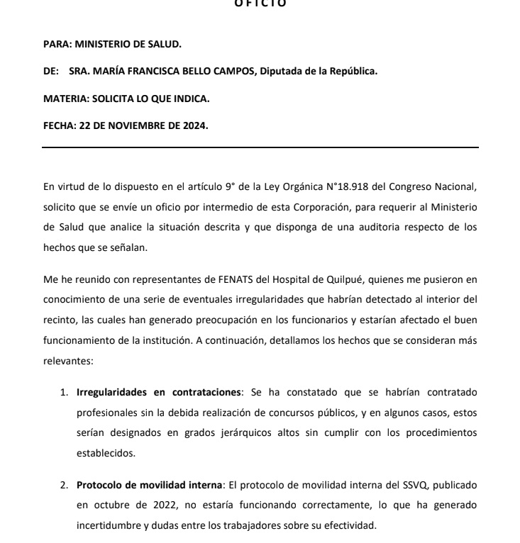 Fue la diputada del Frente Amplio María Francisca Bello quien oficio a la Ministerio de Salud para entregar antecedentes que mostraban irregularidades en contrataciones de personal, creación de jefaturas sin ningún tipo de concurso previo además de denuncias por maltrato, acoso laboral e incluso sexual.