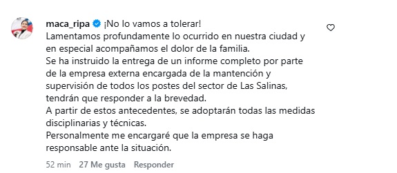 La propia alcaldesa Macarena Ripamonti en redes sociales dijo “lamentamos profundamente lo ocurrido en nuestra ciudad y en especial acompañamos el dolor de la familia. Se ha instruido la entrega de un informe completo por parte de la empresa externa encargada de la mantención y supervisión de todos los postes del sector de Las Salinas, tendrán que responder a la brevedad. A partir de estos antecedentes, se adoptarán todas las medidas disciplinarias y técnicas. Personalmente me encargaré que la empresa se haga responsable ante la situación”.