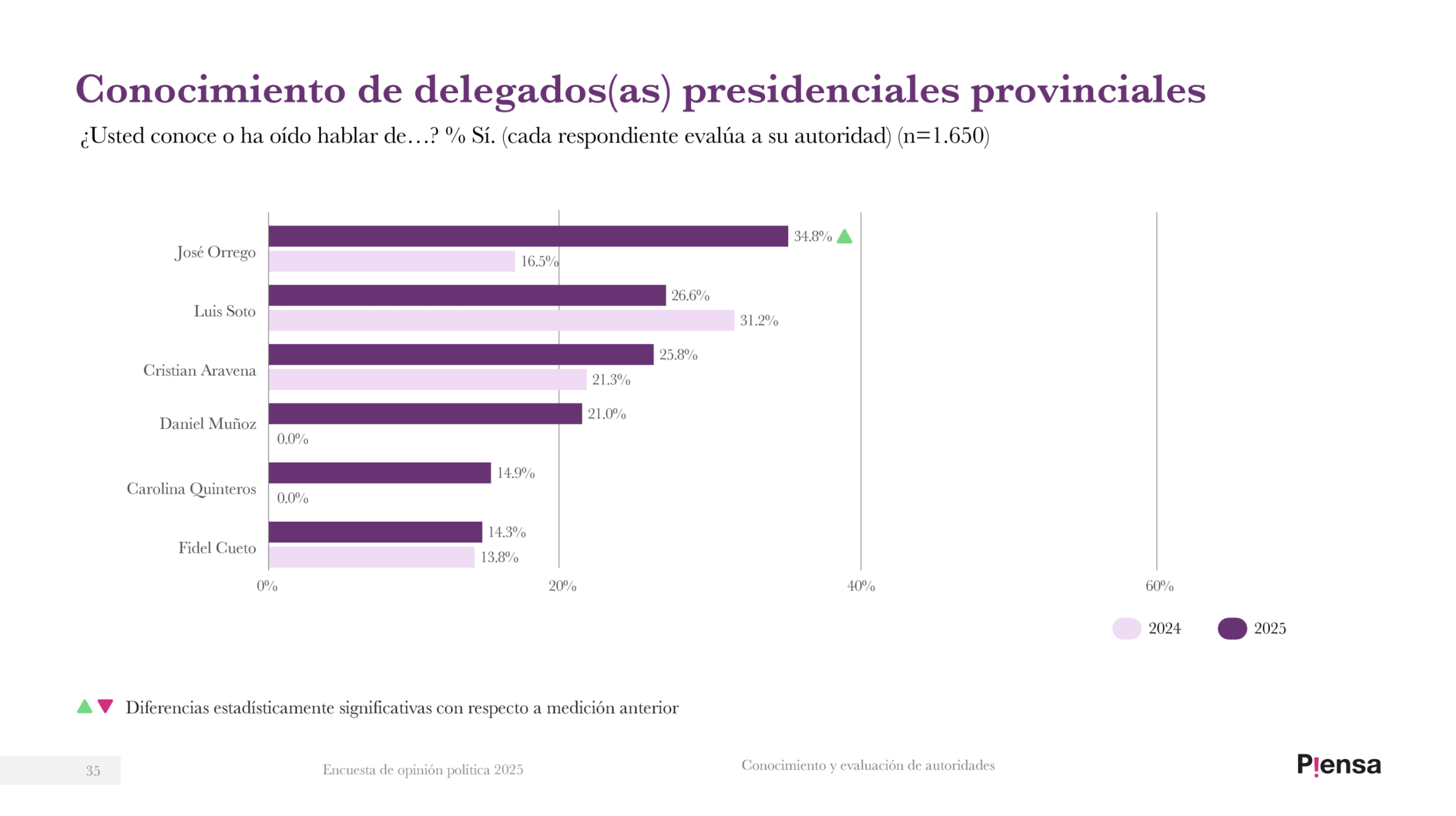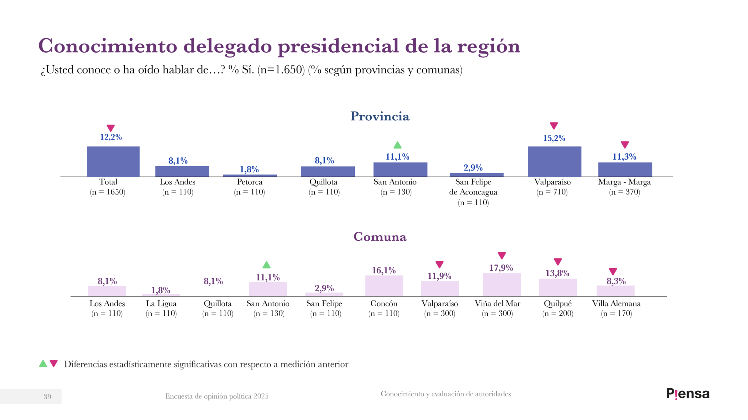 En conjunto, los datos confirman que, pese a algunas alzas puntuales, los delegados presidenciales provinciales mantienen niveles de conocimiento considerablemente bajos frente a otras figuras políticas de la región de Valparaíso.