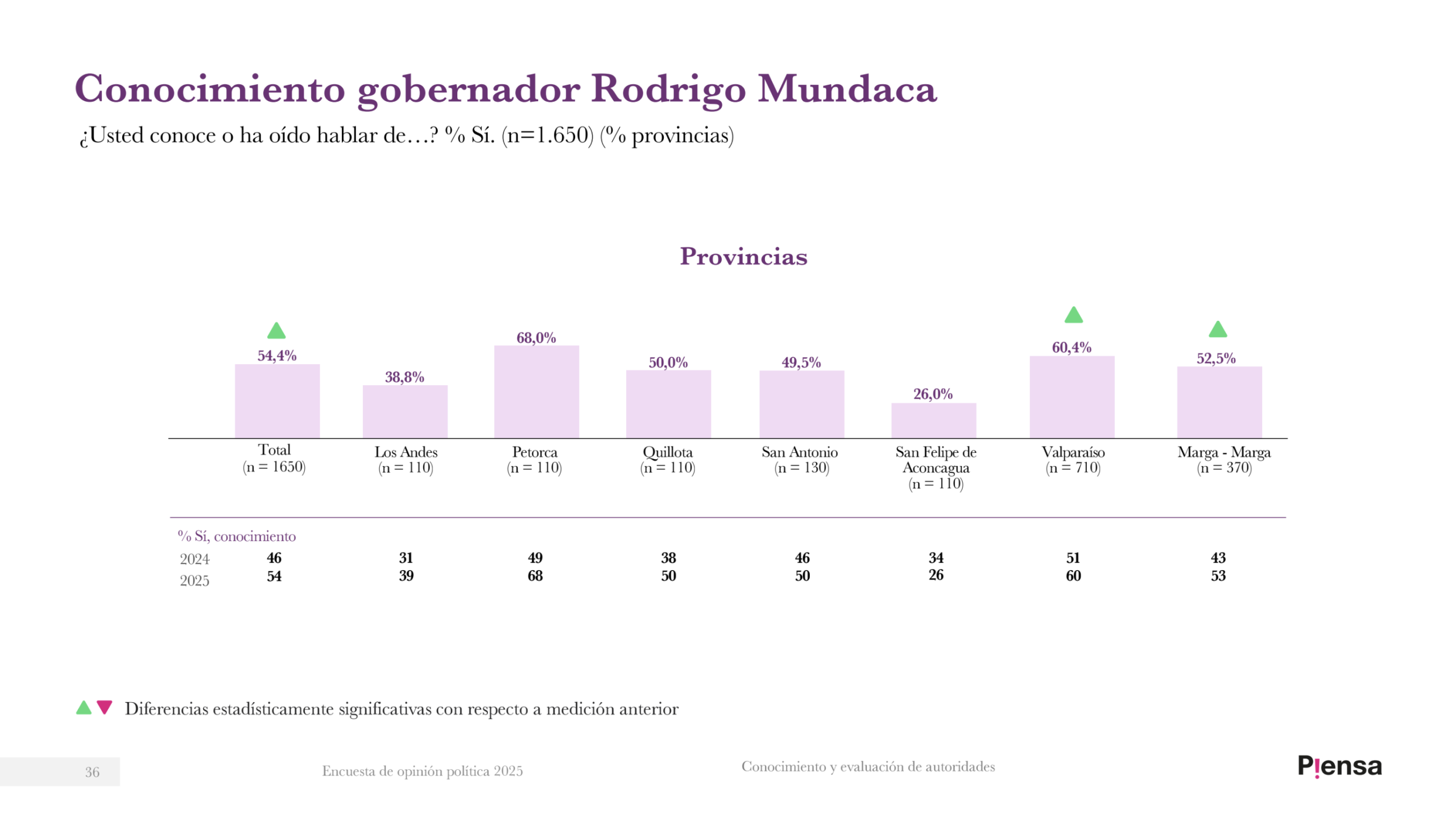 A nivel provincial, el conocimiento de la autoridad presenta importantes variaciones: 38,8% en Los Andes; 68% en Petorca –provincia donde residía antes de asumir el cargo–; 50% en Quillota; 49,5% en San Antonio; 26% en San Felipe; 60,4% en Valparaíso, la más habitada de la región, y 52,5% en Marga Marga.