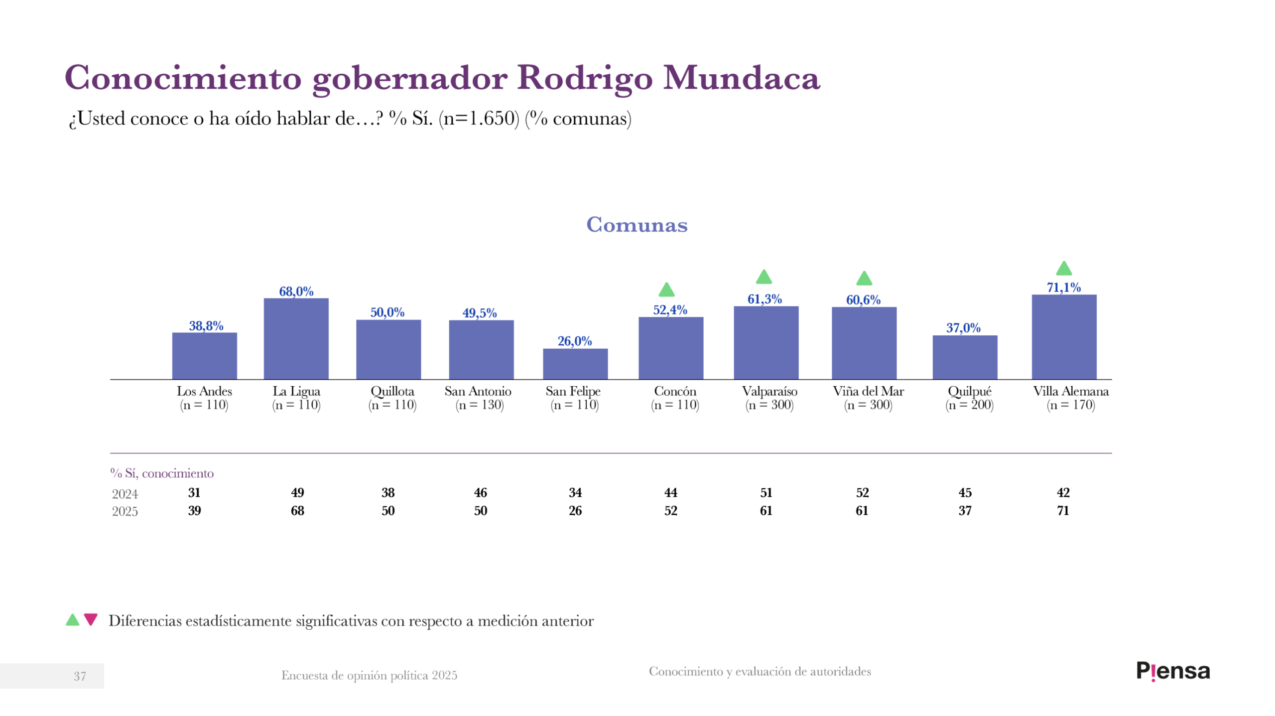 Al desagregar los resultados por comuna, se observa un comportamiento similar. En Los Andes, Mundaca alcanza un conocimiento del 38,8%; en La Ligua, 68%; en Quillota, 50%; en San Antonio, 49,5%; en San Felipe, 26%; en Concón, 52,4%; en Valparaíso, 61,3%; en Viña del Mar, 60,6%; en Quilpué, 37%; y en Villa Alemana, un destacado 71%, el registro más alto del estudio.