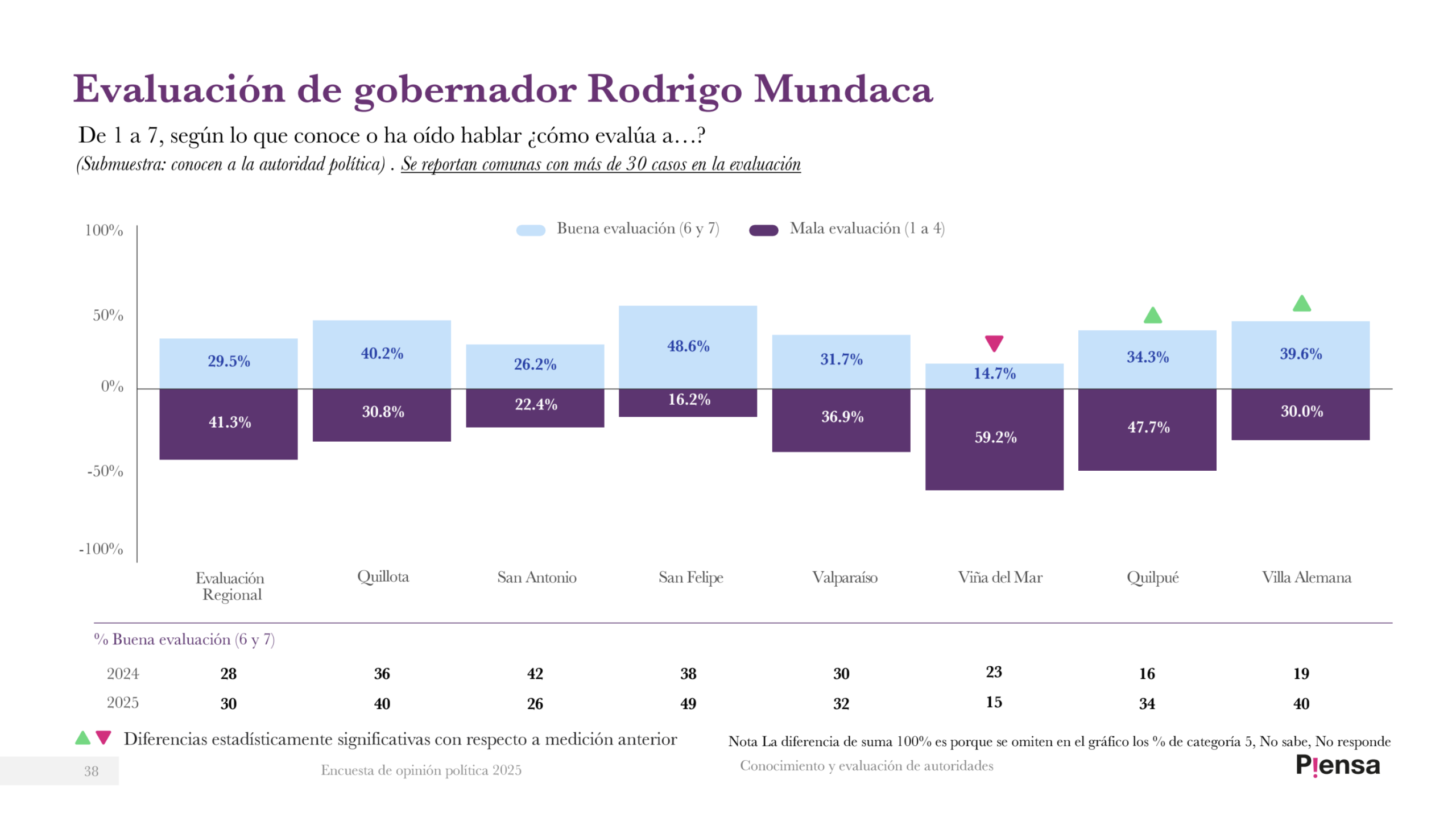 El análisis comunal revela importantes contrastes en la percepción ciudadana. En Quillota, Mundaca obtiene 40,2% de evaluación positiva y 30,8% negativa; en San Antonio, 26,2% buena y 22,4% mala; y en San Felipe, su mejor registro, alcanza 48,6% de aprobación y 16,2% de desaprobación. En las comunas costeras, los números son menos favorables: en Valparaíso, el gobernador obtiene 31,7% de evaluación positiva y 36,9% negativa; en Viña del Mar, apenas 14,7% buena y 59,2% mala. En Marga Marga, Quilpué presenta 34,3% de evaluación positiva y 47,7% negativa, mientras que en Villa Alemana, la valoración mejora con 39,5% de aprobación y 30% de desaprobación.