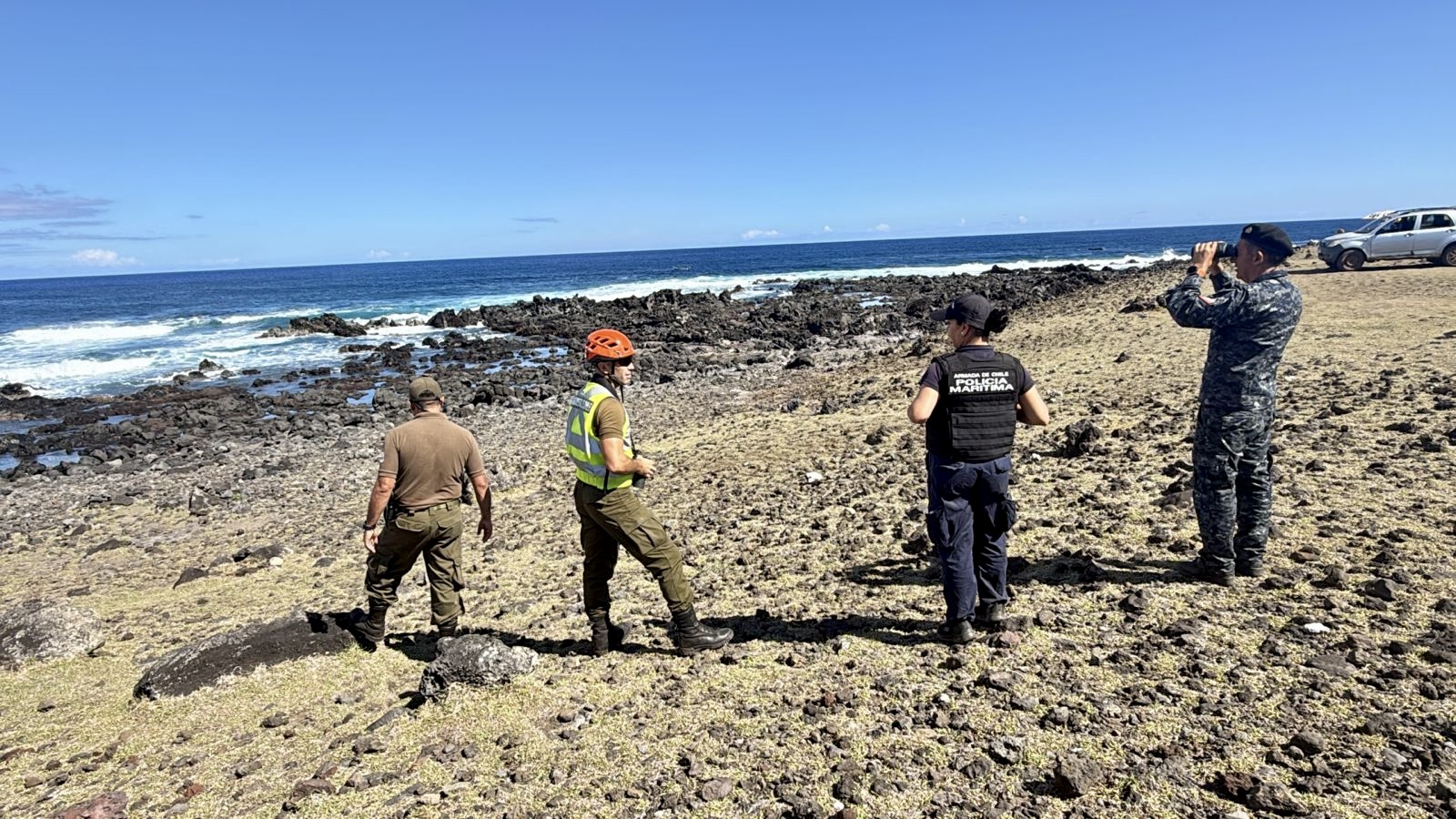 El gobernador marítimo de Hanga Roa, capitán de Fragata LT Miguel Bravo, indicó que, "ya tenemos en el agua medios marítimos operando, principalmente en tareas de buceo, tanto con equipo como en apnea. Además, se está efectuando una búsqueda terrestre en un radio de 10 kilómetros, con Infantería de Marina y Carabineros".