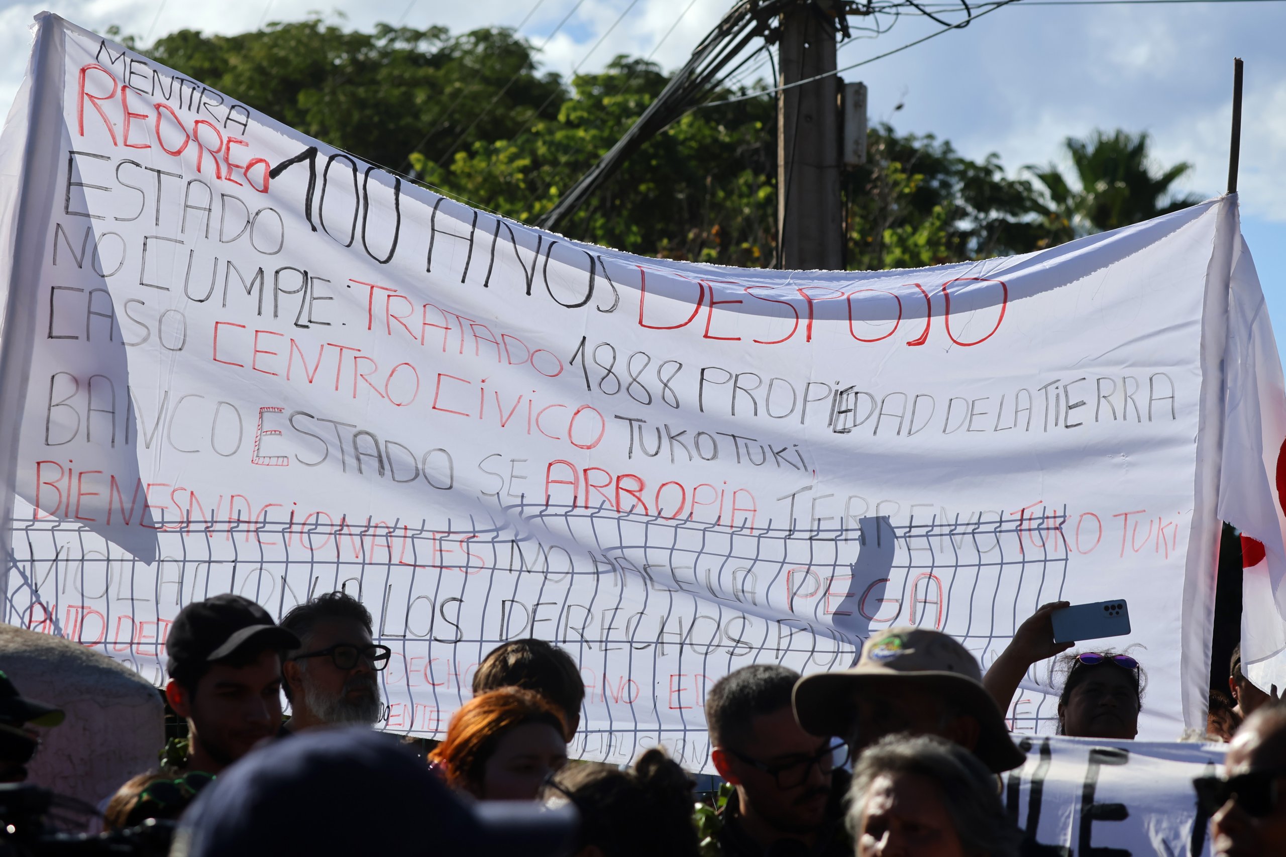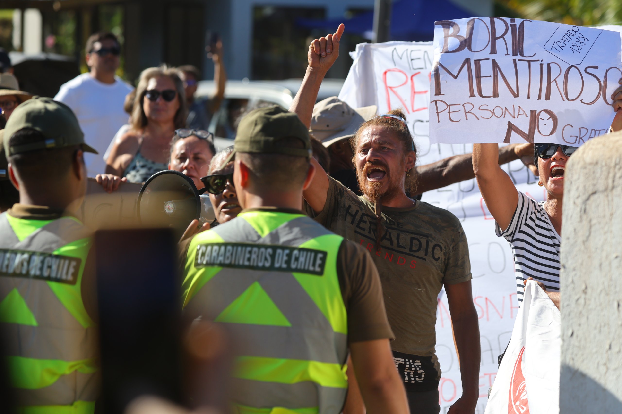 Un grupo de personas llegó al aeropuerto Internacional Mataveri portando carteles y silbatos, quienes gritaron consignas en su contra.
