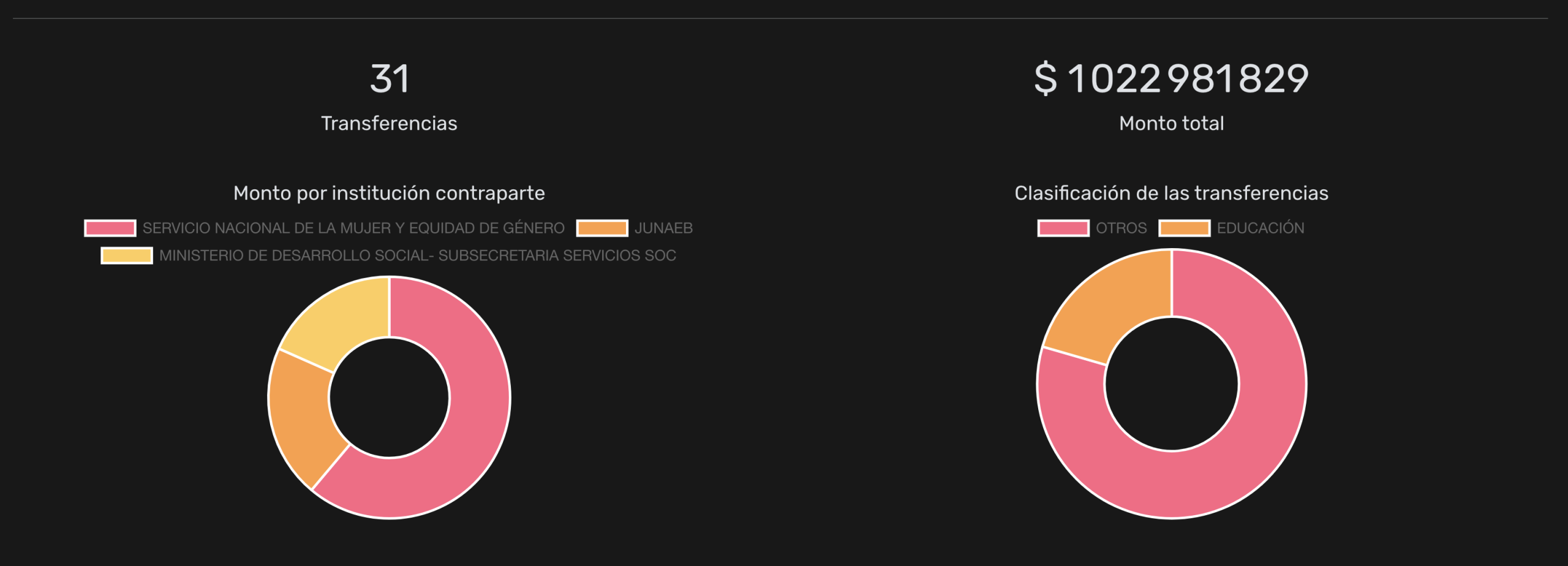 De ese total, $625 millones los aportó el Servicio Nacional de la Mujer y Equidad de Género (Sernameg), aunque el proyecto más costoso ($210 millones) lo financió la Junta Nacional de Auxilio Escolar y Becas (Junaeb) para un Plan de Reactivación Educativa Integral del Mineduc. El segundo, por $96 millones, lo financió la Subsecretaría de Servicios Sociales, del Ministerio de Desarrollo Social, para el convenio que permitía ejecutar el programa «Abriendo Caminos» en la región de Magallanes. El tercero, en tanto, por $72 millones, también fueron aportados por el Sernameg, para el programa «Casa de Acogida» en Chiguayante, región del Biobío.