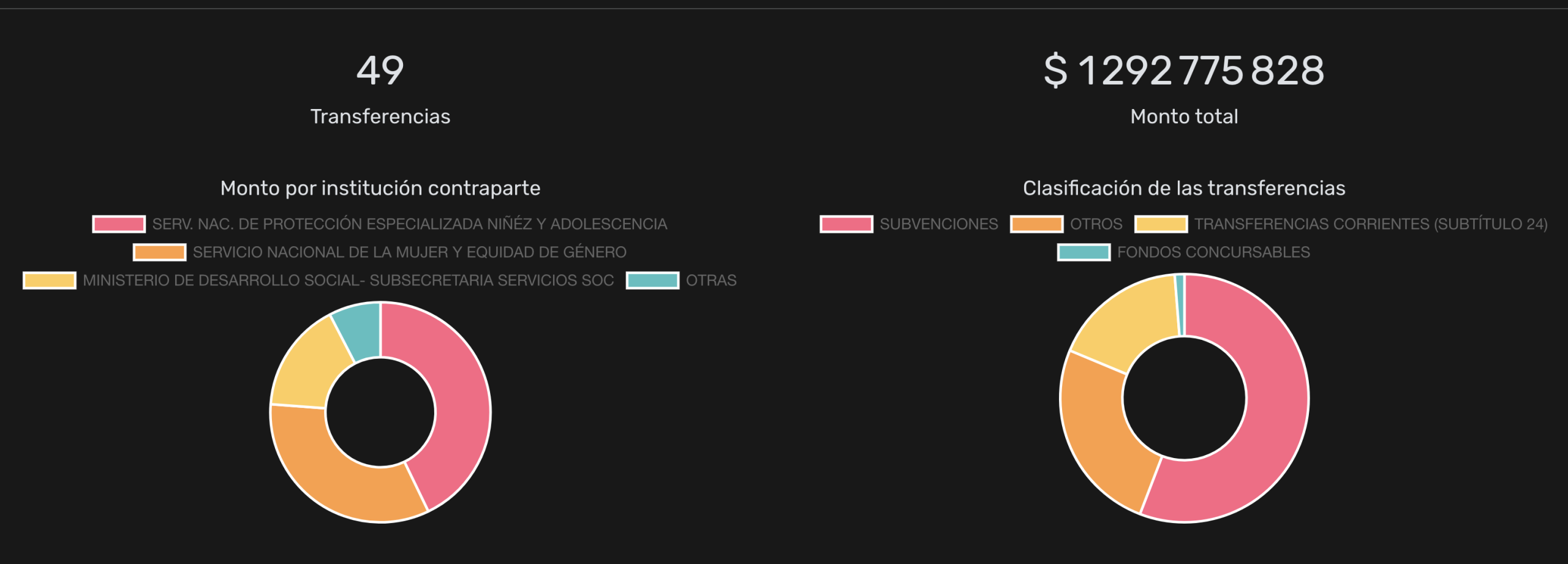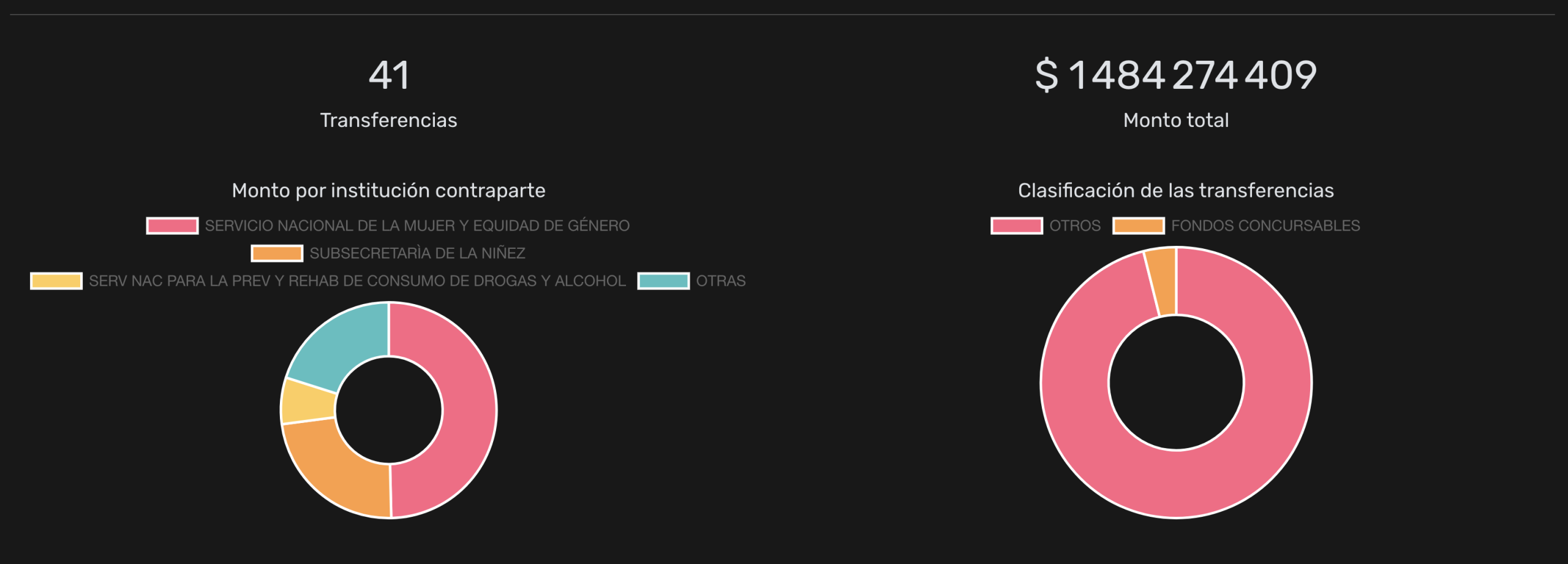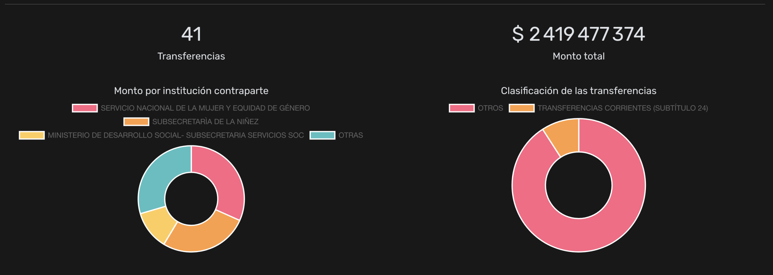 De estos recursos, $533 millones fueron aportados por el Servicio de Protección Especializada a la Niñez y Adolescencia y $209 millones de la Subsecretaría de Servicios Sociales. Durante este año, el monto más alto fue transferido por dicha repartición del Ministerio de Desarrollo Social, por $168 millones para el dispositivo Albergue Protege 2025; seguido por los $101 millones y $87 millones, aportados por el Servicio Nacional de la Mujer para dos iniciativas del programa de recuperación del ejercicio de la autonomía para víctimas y sobrevivientes de violencias de género.