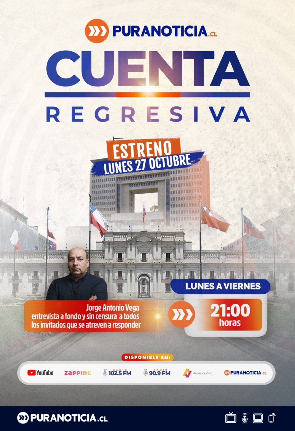 Cabe hacer presente que «Cuenta Regresiva» se emitirá de lunes a viernes, a contar de las 21:00 horas, y podrá seguirlo a través de todas las plataformas del ecosistema de Puranoticia.cl, ya sea a través del sitio web, de las redes sociales, del canal de televisión y en sus cableoperadores, y también en la radio en el dial 102.5FM. Porque Puranoticia.cl es un medio de la región de Valparaíso que se ve, se lee y también se escucha.