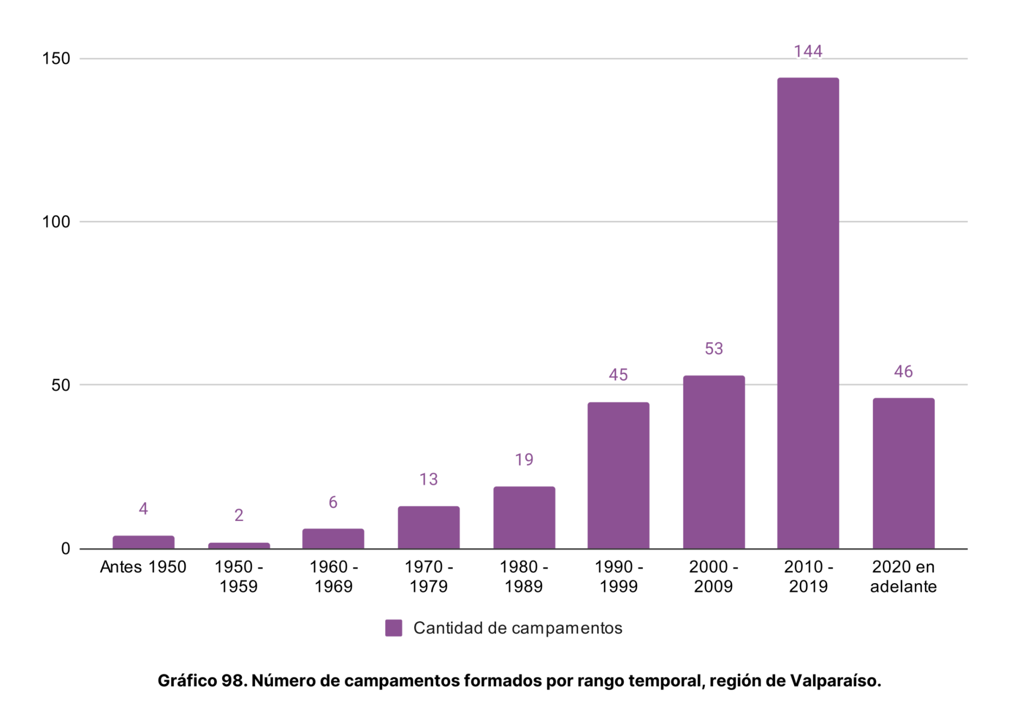 Techo-Chile en su catastro muestra que en la región de Valparaíso, los campamentos activos se formaron principalmente entre los años 2010 y 2019, con un total de 144. De ellos, 53 lo hicieron durante el periodo 2000-2009 y 46 desde el año 2020 en adelante.