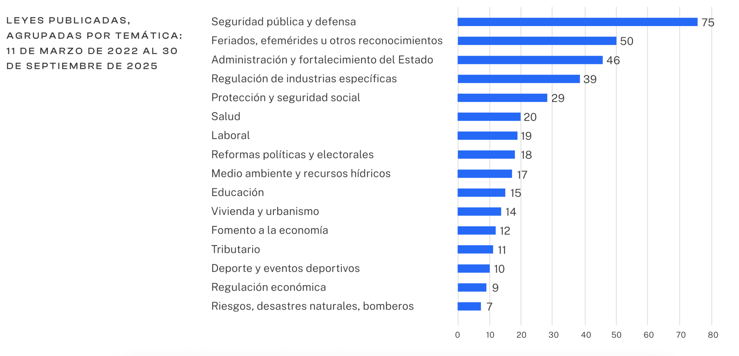 Las temáticas que marcan la agenda legislativa son aquellas vinculadas a seguridad pública y defensa. 19,2% de los proyectos publicados corresponde a esta materia, lo que equivale a 75 iniciativas de ley. Le siguen los feriados, efemérides y reconocimientos (12,8%, 50 proyectos) y las relacionadas con la administración y fortalecimiento del Estado, que con 46 propuestas representan el 11,8%. Recién en el lugar 12 se ubican las reformas asociadas al fomento de la economía (3,1%).