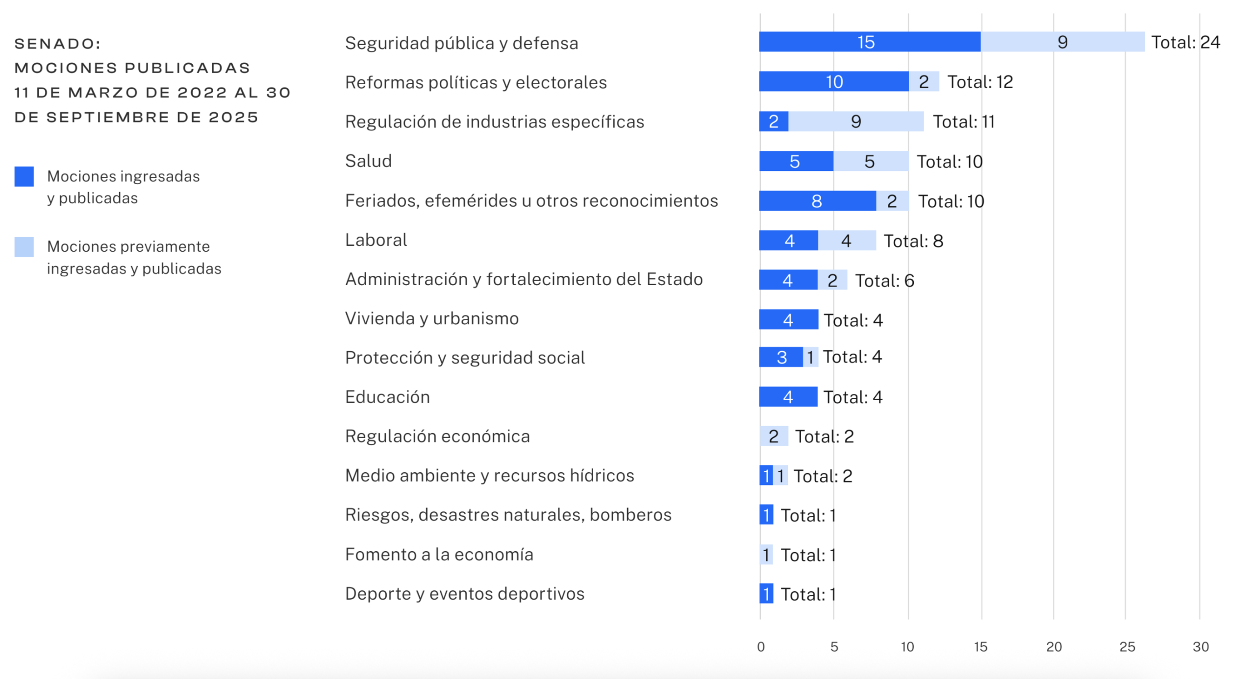 En cuanto al Congreso Nacional, las mociones ingresadas por senadores desde el 11 de marzo de 2022 suman 831 iniciativas. De ellas, 62 llegaron a ser publicadas, lo que implica una efectividad de 7,5%. En ese sentido, se evidencia una mayor probabilidad de éxito cuando las mociones cuentan con el patrocinio del Ejecutivo: de las 62 publicadas, 54 (87,1%) recibieron algún tipo de urgencia durante su tramitación. En cuanto a mociones originadas en el Senado que se publicaron entre 2022 y 2025, la cifra es de 100 iniciativas de ley, de las cuales 85 fueron patrocinadas por el Gobierno.