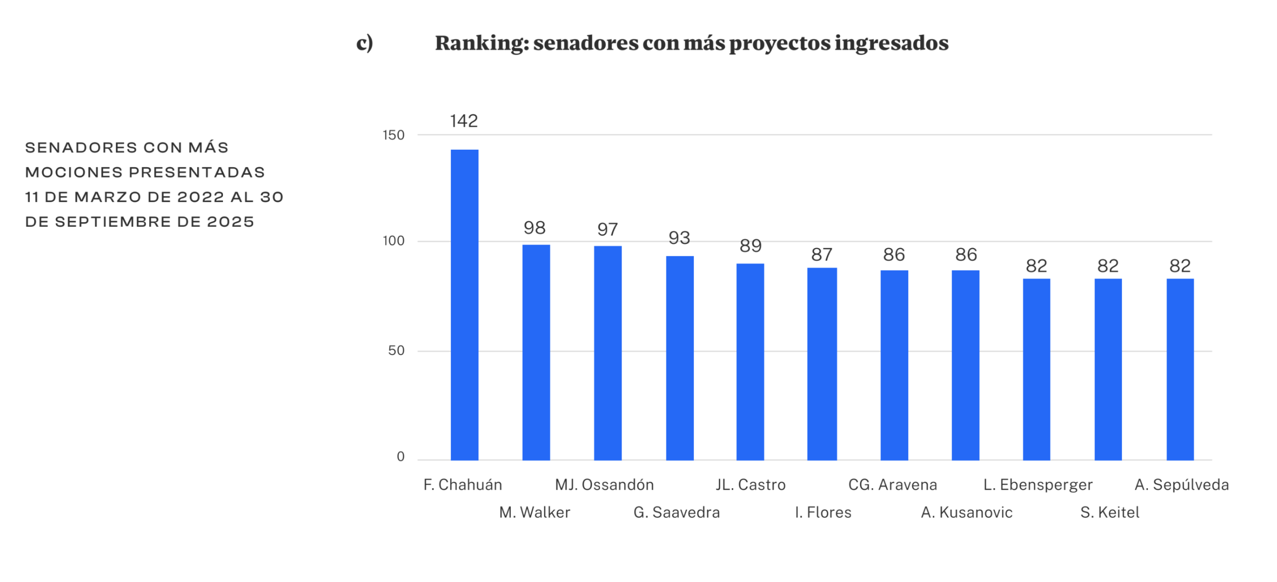 Haciendo un ranking de los senadores que más proyectos han ingresado entre el 11 de marzo de 2022 al 30 de septiembre de 2025, el estudio muestra que Francisco Chahuán lidera el listado con 142 mociones presentadas en el periodo en análisis. Completan el podio Matías Walker y Manuel José Ossandón, con 98 y 97 mociones respectivamente.