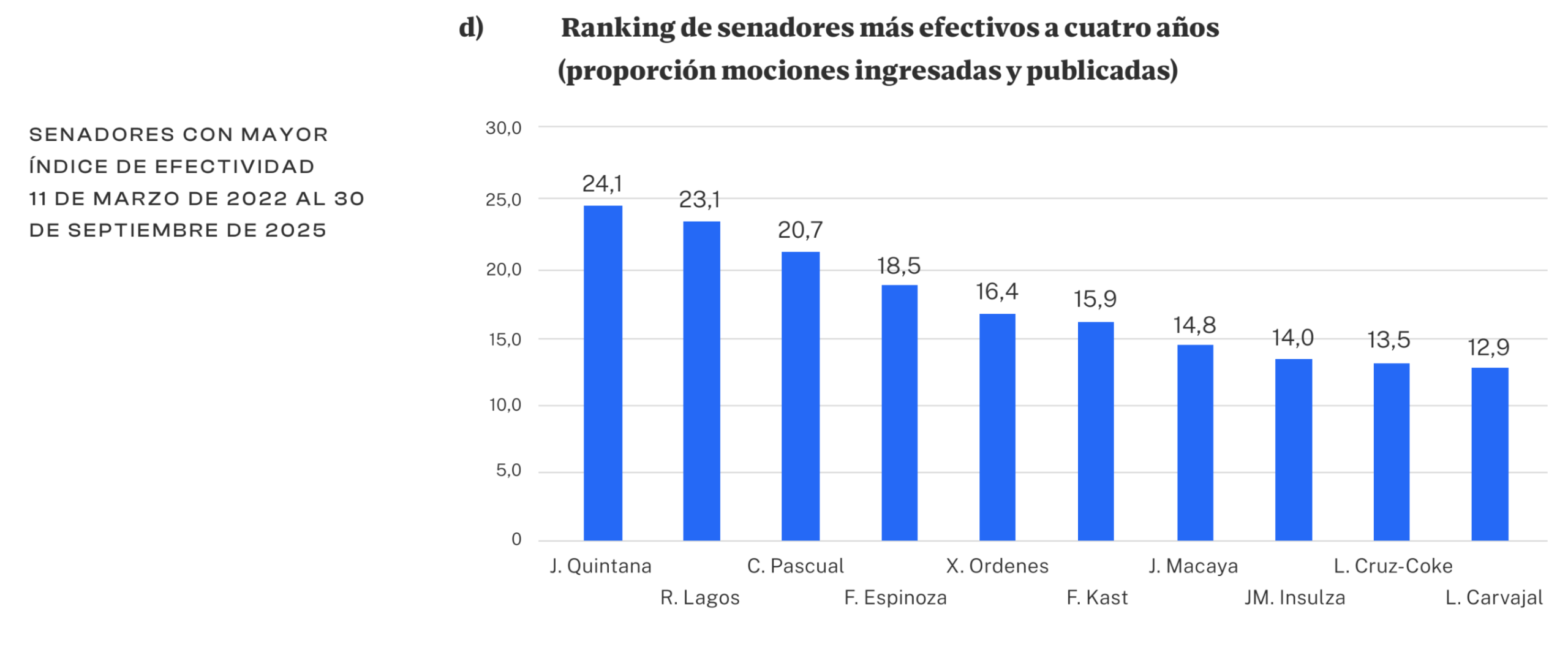 Ahora bien, si la lupa se pone en los senadores con mayor índice de efectividad entre marzo de 2022 y septiembre de 2025, vale decir, si se hace una proporción entre las mociones ingresadas y finalmente publicadas, el estudio muestra que Jaime Quintana lidera con 24,1, seguido por Ricardo Lagos Weber (23,1) y Claudia Pascual (20,7).