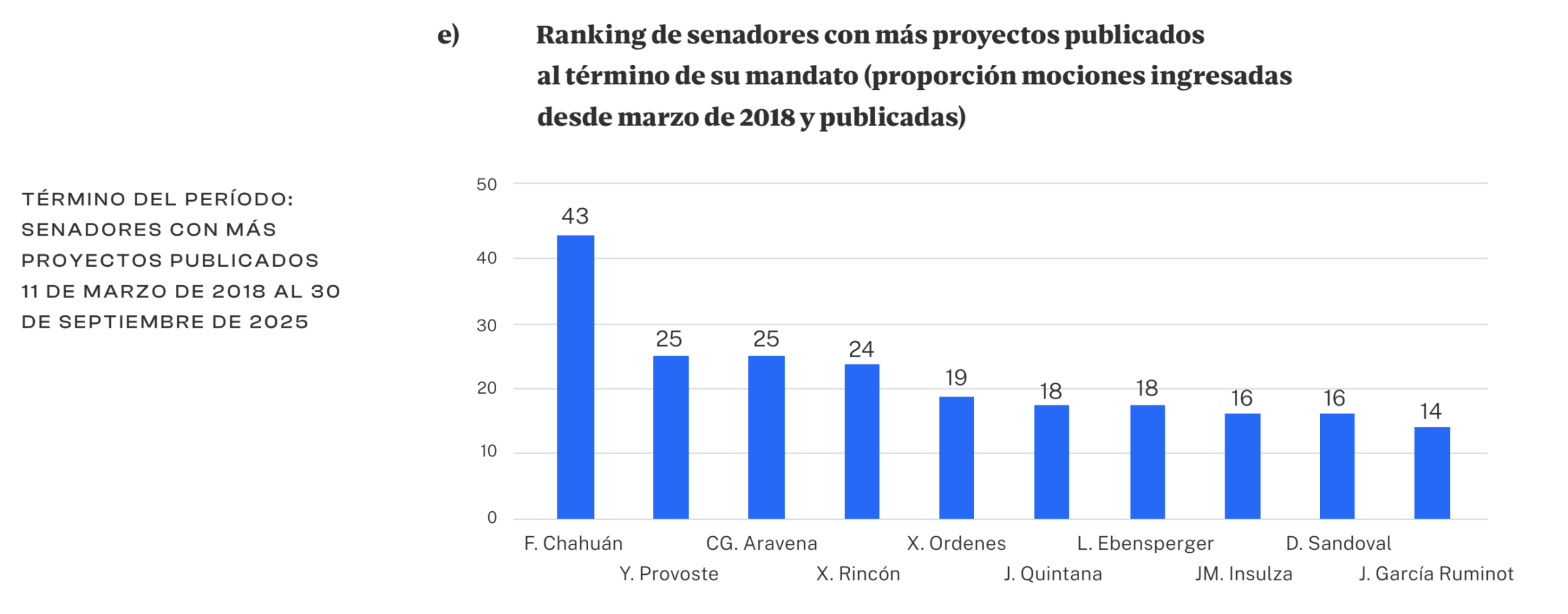 Si se hace un ranking de los senadores con más proyectos publicados al cierre de su mandato legislativo (2018-2025), teniendo en cuenta la proporción de mociones ingresadas desde el 11 de marzo de 2018 y publicadas a la fecha, se detecta que Francisco Chahuán vuelve a liderar, con 43 mociones en estos siete años y medio. Le sigue Yasna Provoste, con 25 proyectos; misma cifra que Carmen Gloria Aravena.
