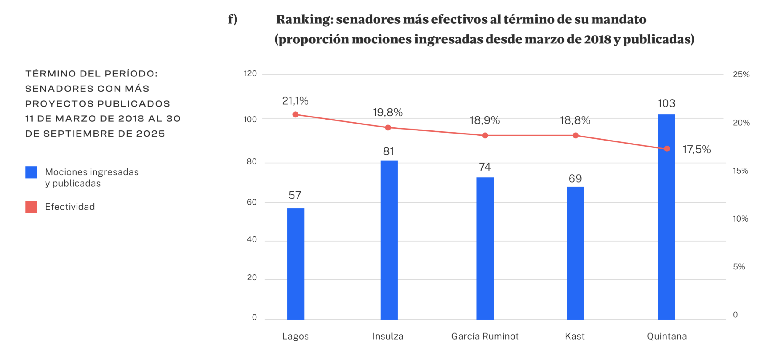 Finalmente, si se hace el mismo ejercicio del párrafo anterior, pero ahora poniendo la lupa en la efectividad, vale decir, haciendo una proporción de mociones ingresadas desde marzo de 2018 y publicadas a la fecha, quien lidera es Ricardo Lagos Weber, con 57 proyectos publicados, correspondiente a una efectividad de 21,1%. Le sigue José Miguel Insulza, con 81 mociones (19,8%) y José García Ruminot, con 74 (18,9%).