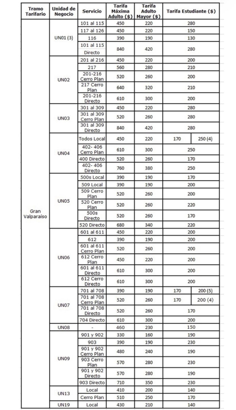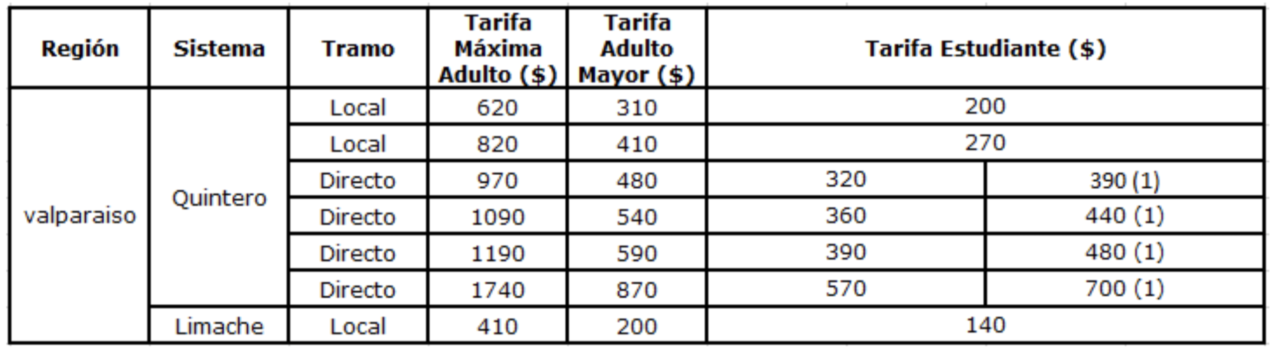 En tanto, las tarifas para la regulación del Gran Valparaíso (Valparaíso, Viña del Mar, Concón, Quilpué y Villa Alemana) desde el 28 de febrero serán: