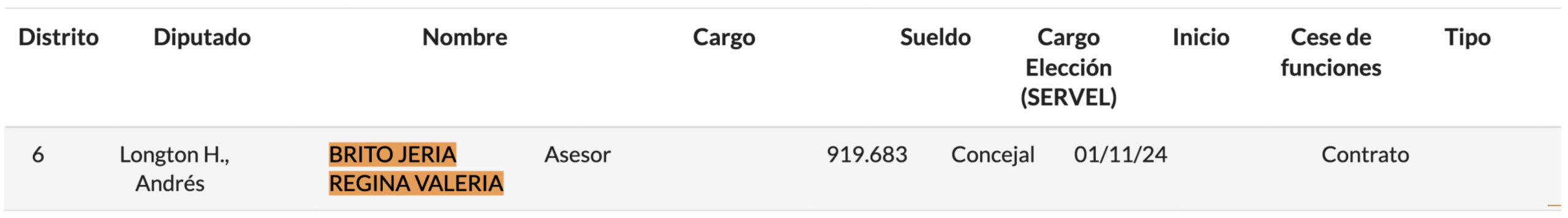 No obstante, su labor no se limita sólo al ámbito municipal en Quillota, puesto que Regina Brito también figura como asesora del diputado Andrés Longton (también de las filas de Renovación Nacional), bajo la modalidad de contrato, desde el 1 de noviembre de 2024, y con una remuneración de $919.683 mensuales, tal como verificó Puranoticia.cl en la página de Transparencia de la Cámara de Diputados.