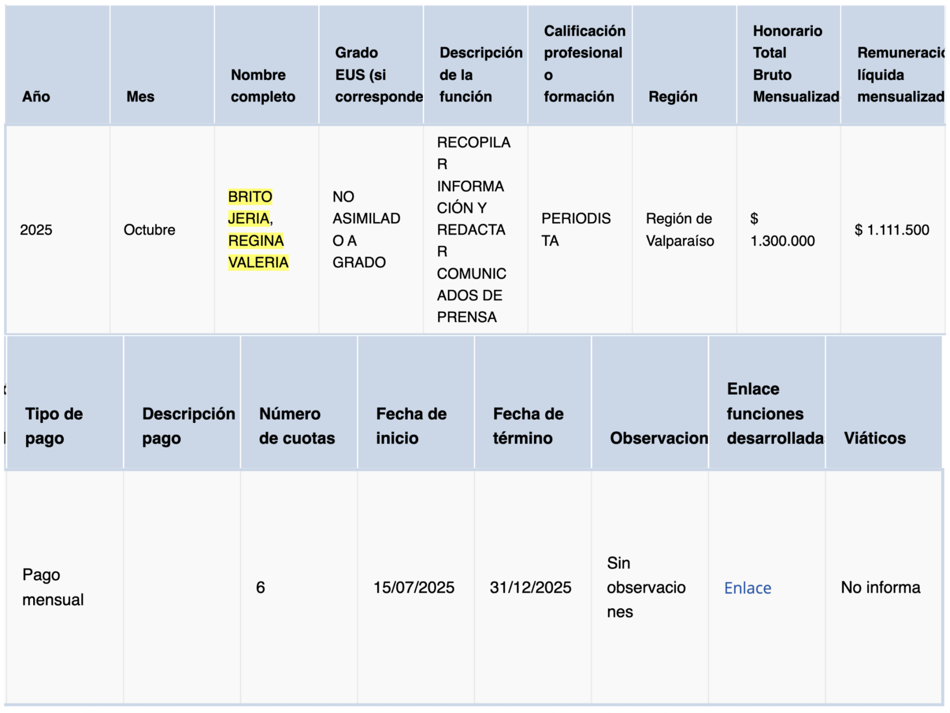Pero eso no es todo, ya que paralelamente la multifacética Concejala de Quillota también cumple funciones como periodista en el Municipio de Villa Alemana, cargo por el que desde abril de 2025 recibe un sueldo de $1.300.000 por recopilar información y redactar comunicados de prensa, según consta en Transparencia Activa de la casa edilicia que administra el alcalde Nelson Estay, cercano a Chile Vamos.