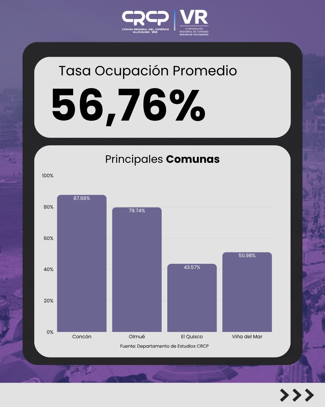 A nivel territorial, el barómetro muestra una alta heterogeneidad en la ocupación proyectada. Entre los destinos con mayor reserva destacan Concón (87,68%) y Olmué (79,74%), mientras que otras zonas presentan niveles más contenidos, como Viña del Mar (50,98%) y El Quisco (43,57%).