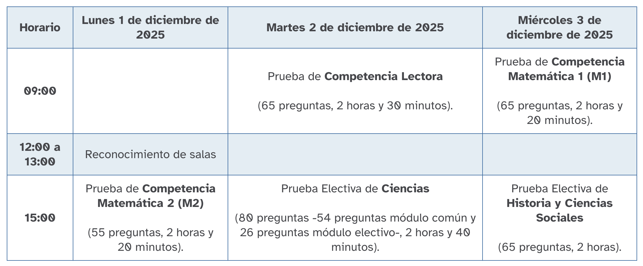 El reconocimiento de salas para la PAES Regular correspondiente al Proceso de Admisión 2026 se efectuará el lunes 1 de diciembre, entre las 12:00 y 13:00 horas. Estas son las fechas y los horarios de las pruebas. Recuerda que debes llegar a tu local de rendición con al menos 30 minutos de anticipación al comienzo de cada prueba.