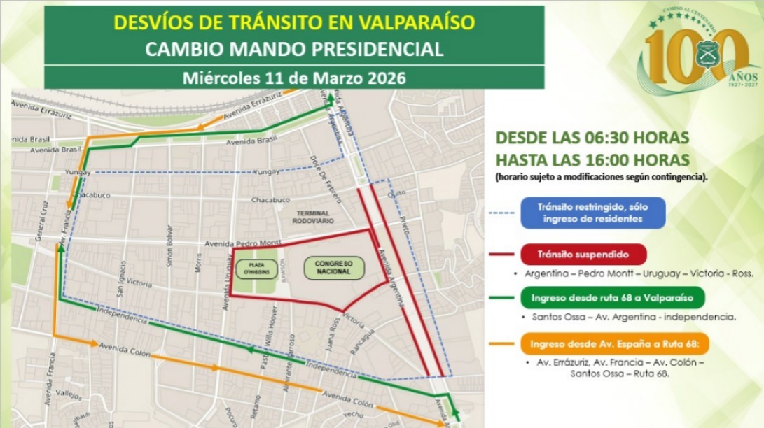 Además, desde la Municipalidad de Valparaíso informaron a través de sus canales oficiales que la Feria de Avenida Argentina permanecerá cerrada durante la jornada. Asimismo, el Terminal Rodoviario de Valparaíso suspenderá su funcionamiento entre las 05:10 y las 15:00 horas. Como medida alternativa, se habilitará una salida provisoria de buses frente a la Universidad Católica, específicamente en el tramo comprendido entre las calles Brasil y Errázuriz.