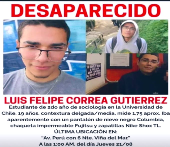 76 días pasaron desde que se perdió el rastro de Luis Felipe Correa Gutiérrez, joven de 19 años, estudiante de Sociología de la Universidad de Chile y oriundo de San Bernardo, cuyo nombre comenzó a circular a fines de agosto entre medios de comunicación, cadenas por redes sociales y afiches que sus amigos y familiares comenzaron a pegar en distintos puntos, con la esperanza de encontrarlo con vida.