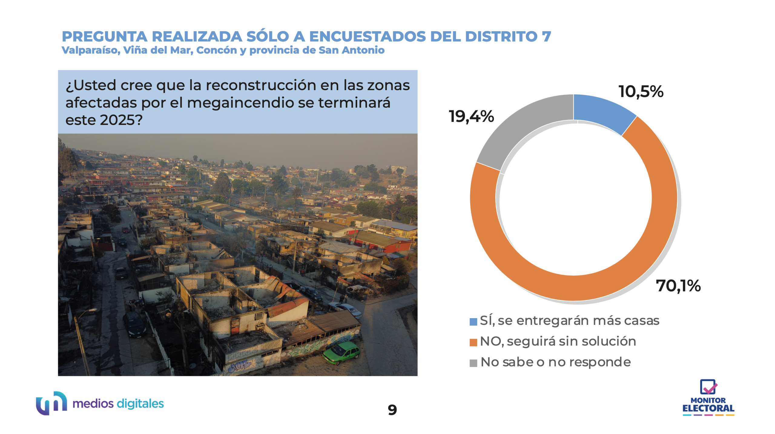 Sobre este punto se enfocó la cuarta y última pregunta realizada por la encuesta: ¿Usted cree que la reconstrucción en las zonas afectadas por el megaincendio se terminará este 2025? Acá, también las respuestas fueron tajantes.