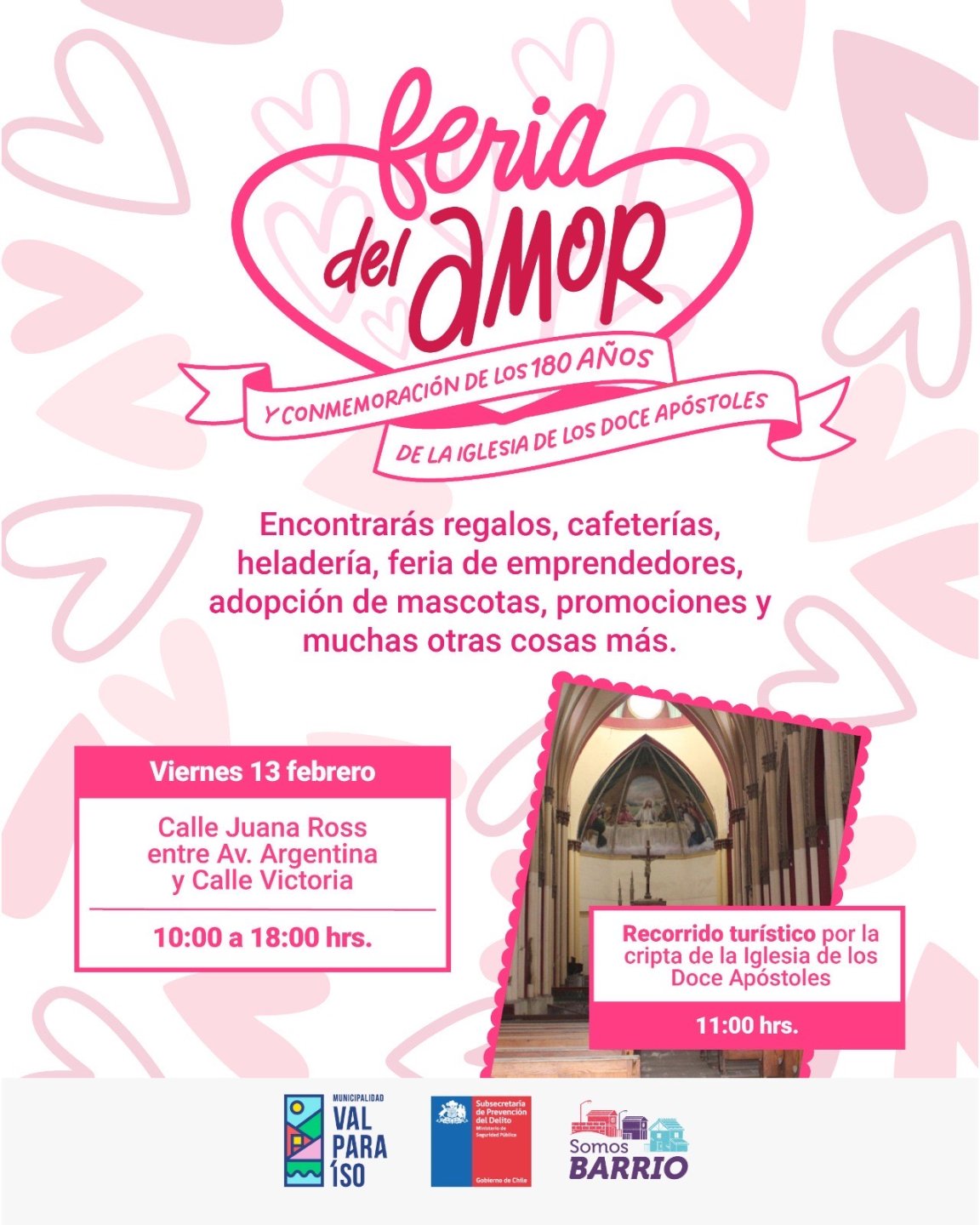 Durante la jornada, vecinos y visitantes podrán recorrer una feria de emprendimientos locales y comprar regalos para celebrar el Día del Amor, el 14 de febrero, además de participar en actividades culturales, espacios informativos, adopción de mascotas y acciones pensadas para toda la familia, en un ambiente que invita a celebrar el amor por el barrio, su historia y su identidad. Dentro de las actividades más destacadas, están los recorridos gratuitos por las criptas de la Iglesia de los Doce Apóstoles que conmemora 180 años de existencia.