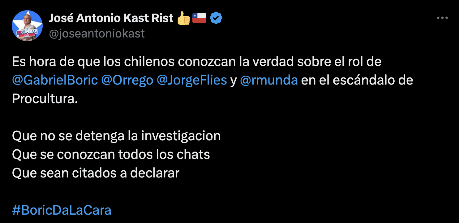 De esta forma, el texto legal indica que "la cuenta oficial del dirigente del Partido Republicano, señor José Antonio Kast Rist, quien a las 10:11 am del día sábado 12 de octubre de 2024, efectuó una publicación acompañando un video, señalando en el mensaje escrito: ‘Es hora de que los chilenos conozcan la verdad sobre el rol de @GabrielBoric @Orrego @JorgeFlies y @rmunda en el escándalo de Procultura. Que no se detenga la investigación Que se conozcan todos los chats; Que sean citados a declarar’”.