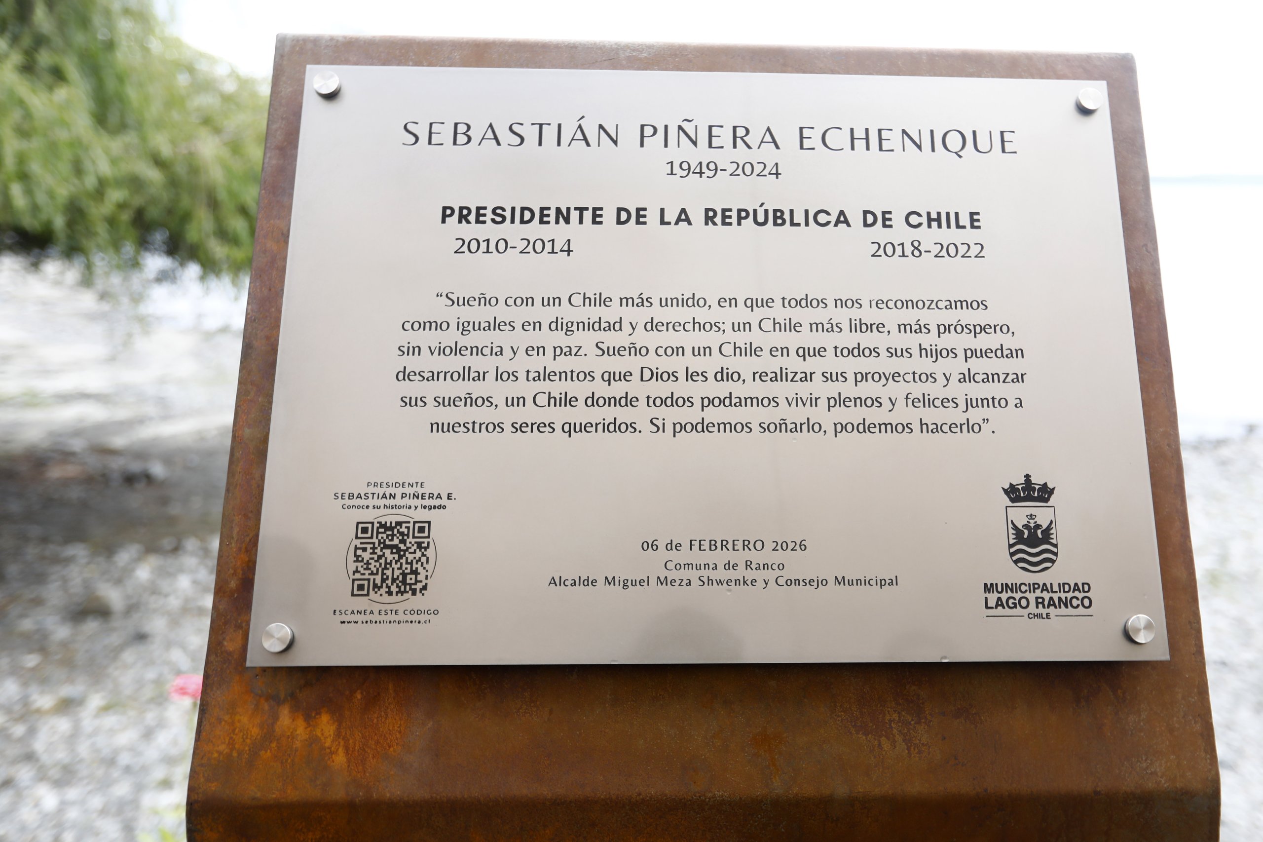 La placa que se encuentra a orilla del lago cuenta con la frase: “Sueño con un Chile más unido, en que todos nos reconozcamos como iguales en dignidad y derechos; un Chile más libre, más próspero, sin violencia y en paz. Sueño con un Chile en que todos sus hijos puedan desarrollar los talentos que Dios les dio, realizar sus proyectos y alcanzar sus sueños, un Chile donde todos podamos vivir plenos y felices junto a nuestros seres queridos. Si podemos soñarlo, podemos hacerlo”.