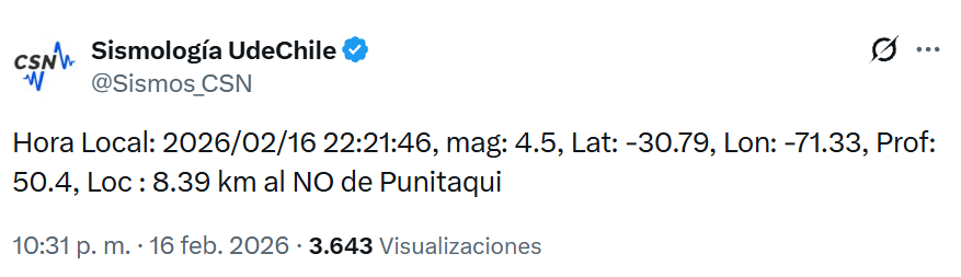 De acuerdo con datos del Centro Sismológico Nacional, el primer movimiento ocurrió a las 22:16:54 horas y alcanzó una magnitud 3,6. Su epicentro se localizó a 16 kilómetros al oeste de Punitaqui, con una profundidad de 44 kilómetros.