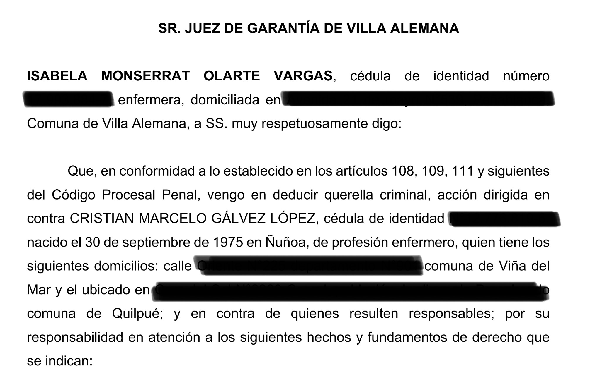 Momento seguido, Cristián Gálvez le menciona acerca de un documento que sólo se encontraba alojado en su casilla personal de correo electrónico: "El querellado me indica la naturaleza del documento que, a todas luces, se logra su acceso por la vulneración de los medios digitales que hacía uso en mi trabajo", denuncia la enfermera en la querella presentada ante el Juzgado de Garantía de Villa Alemana.