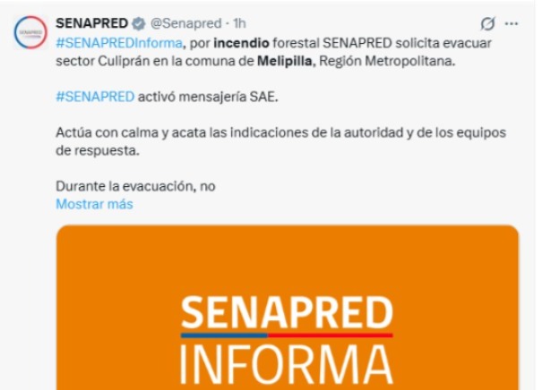 El Servicio Nacional de Prevención y Respuesta ante Desastres (SENAPRED) solicitó la evacuación preventiva del sector Culiprán, en Melipilla, debido a un incendio forestal que amenaza la seguridad de los vecinos. Las autoridades activaron el sistema de alertas SAE.