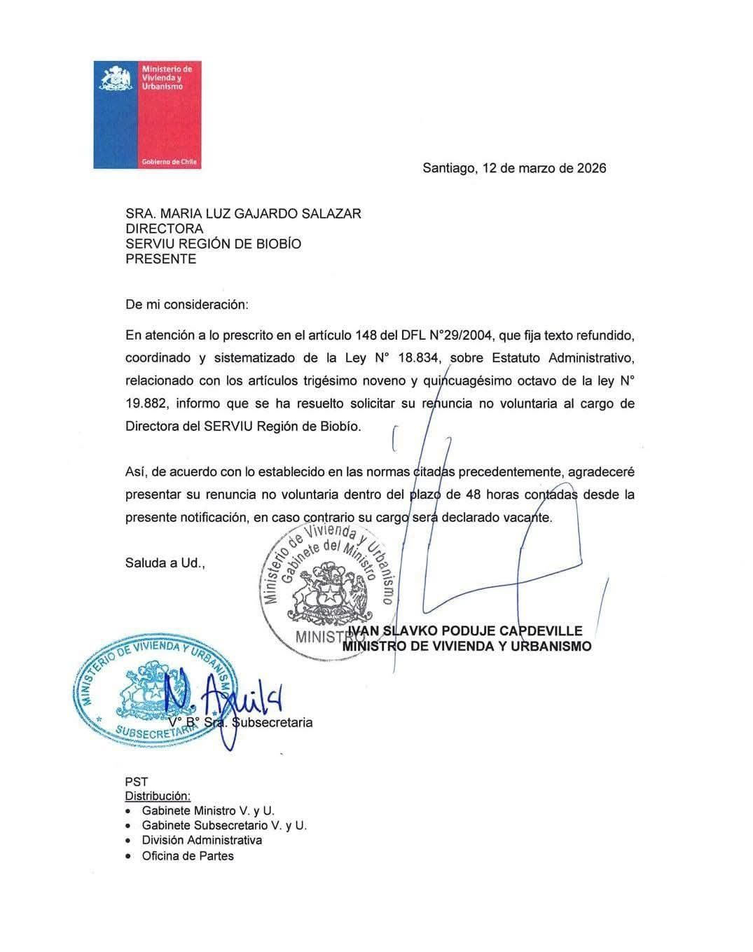 El ministro de Vivienda y Urbanismo, Iván Poduje, confirmó que solicitó la renuncia "no voluntaria" de la directora del Servicio de Vivienda y Urbanización (Serviu) de Biobío, María Luz Gajardo.