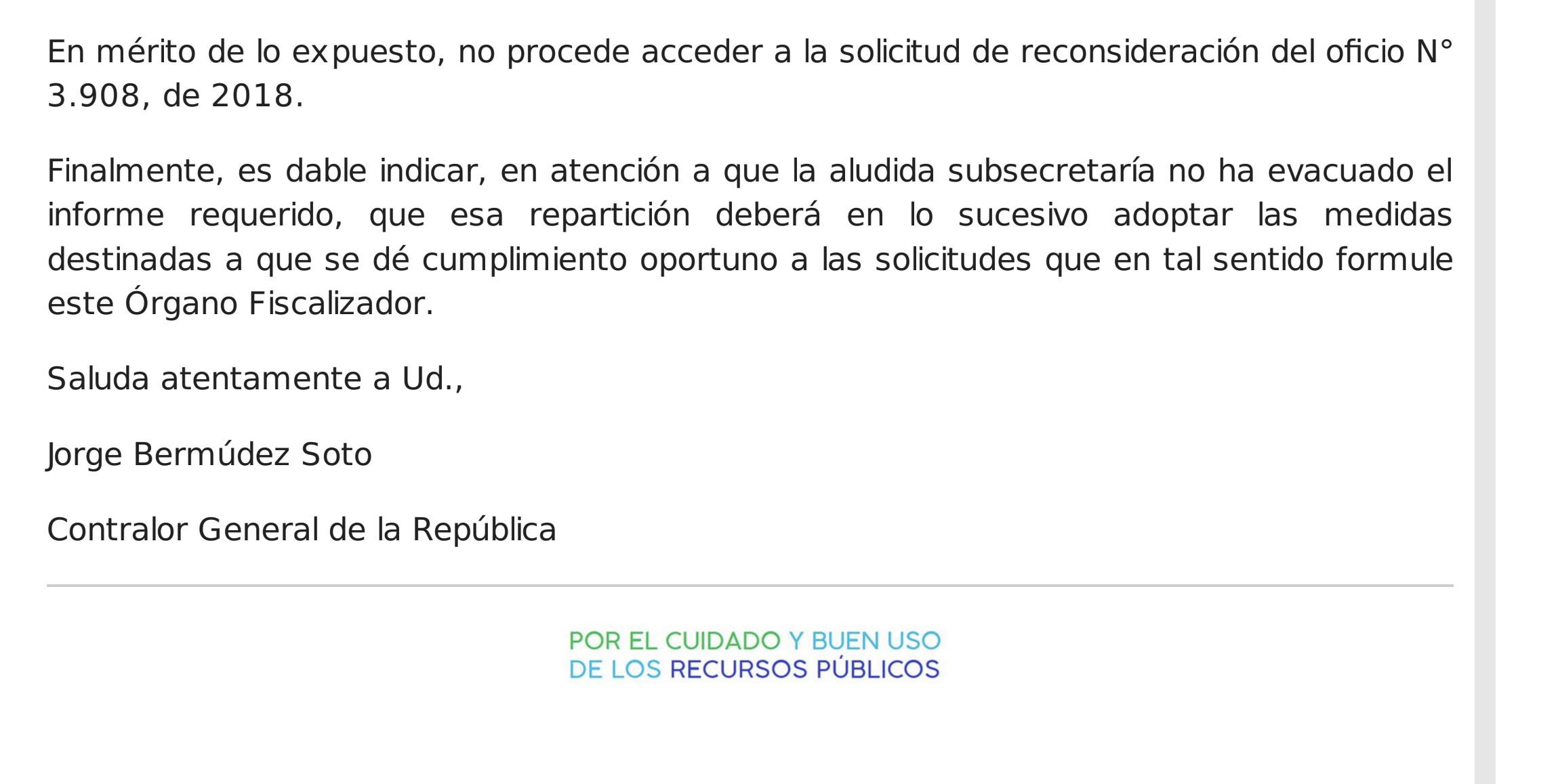 Una vez sabida aquella situación, un representante de Inmobiliaria del Puerto SpA. solicitó el 8 de octubre de 2018 la reconsideración del oficio N° 3.908 de Contraloría, pues señaló que éste se llevó sin la participación de la empresa y que se trataba de un asunto sometido al conocimiento de los tribunales de justicia. La respuesta del órgano fiscalizador dice que el oficio aludido "no contiene un pronunciamiento de orden jurídico, sino que tan solo una verificación de hechos en relación al desarrollo del proyecto de que se trata y la actuación municipal".